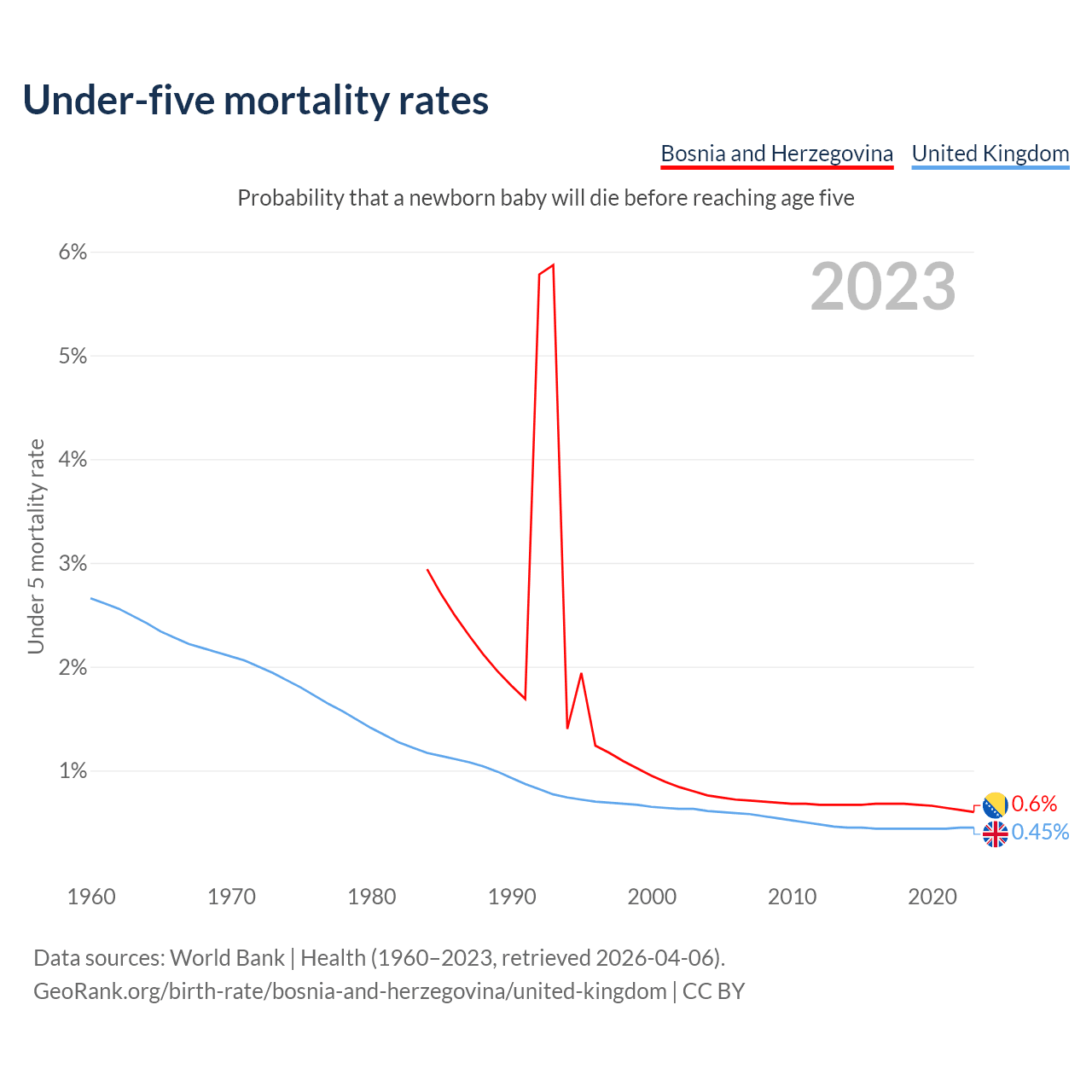 The chance that a newborn baby will die before reaching age five is 0.6% in Bosnia and Herzegovina and 0.45% in the United Kingdom. Above is a chart with historical data on under-five mortality rates.