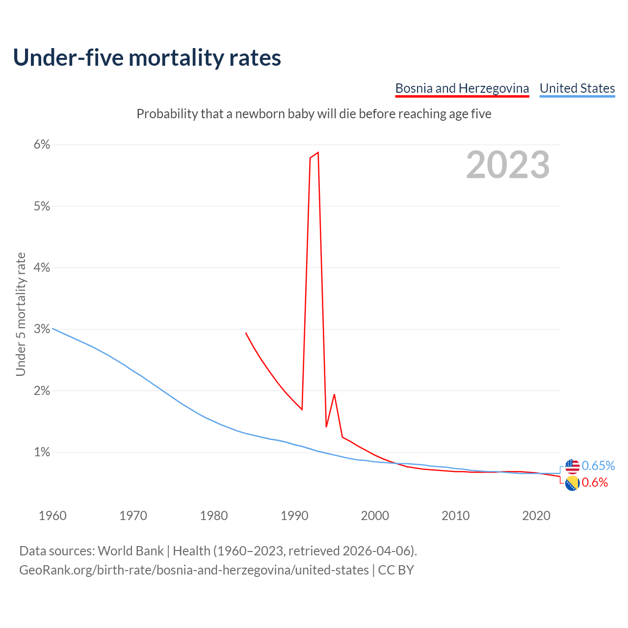 The chance that a newborn baby will die before reaching age five is 0.6% in Bosnia and Herzegovina and 0.65% in the United States. Above is a chart with historical data on under-five mortality rates.