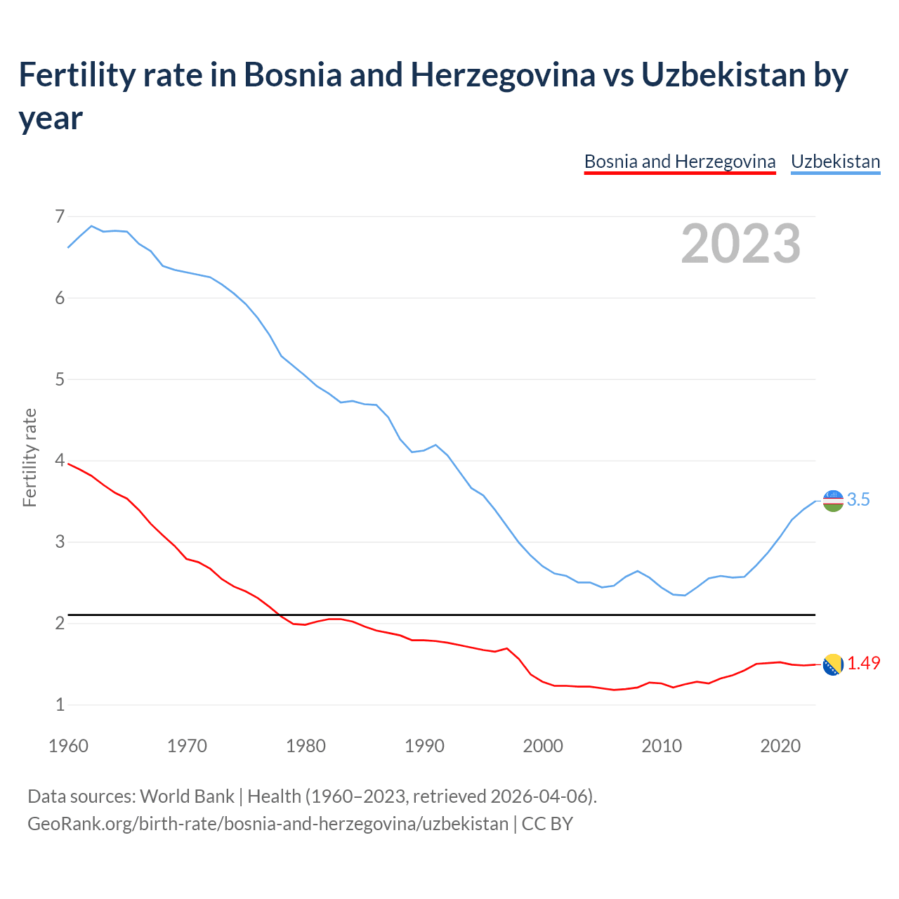 1960 vs 2023, the fertility rate has decreased by 62.5% in Bosnia and Herzegovina and by 47.1% in Uzbekistan — in 1960, it was 3.96 and 6.61, respectively.