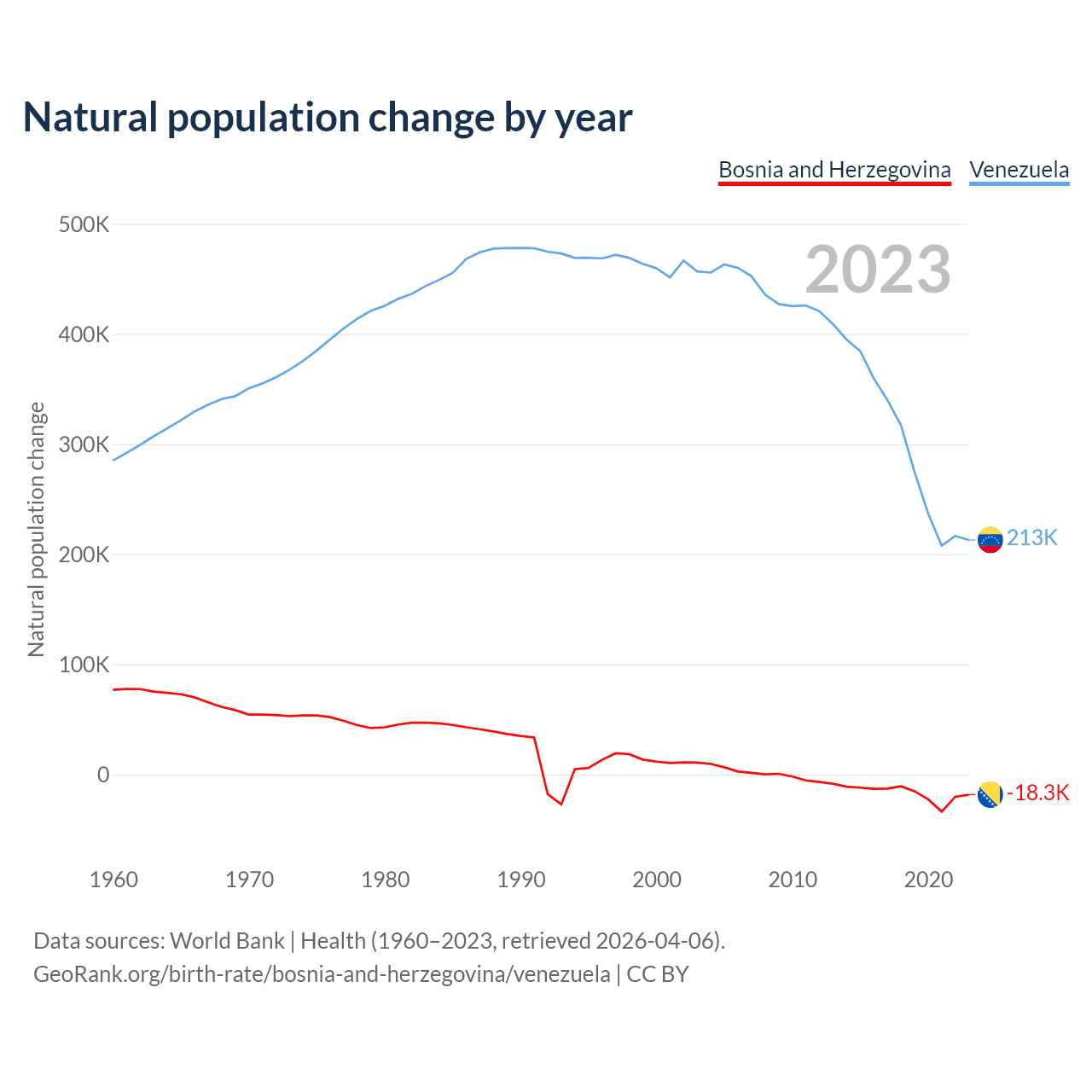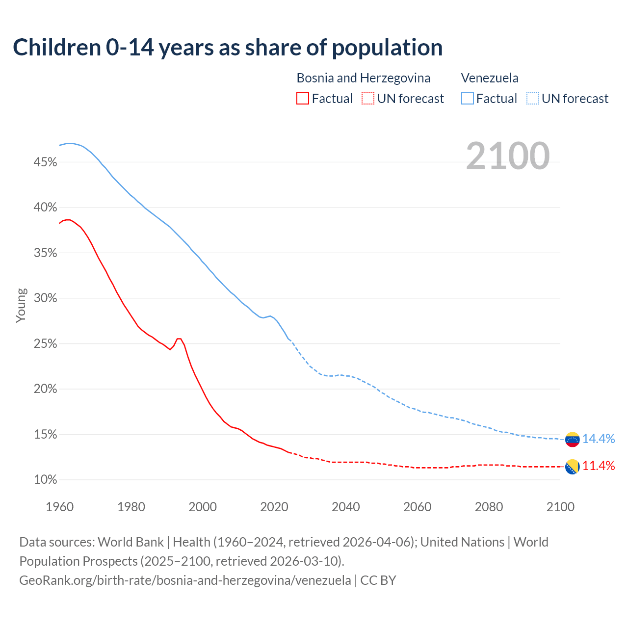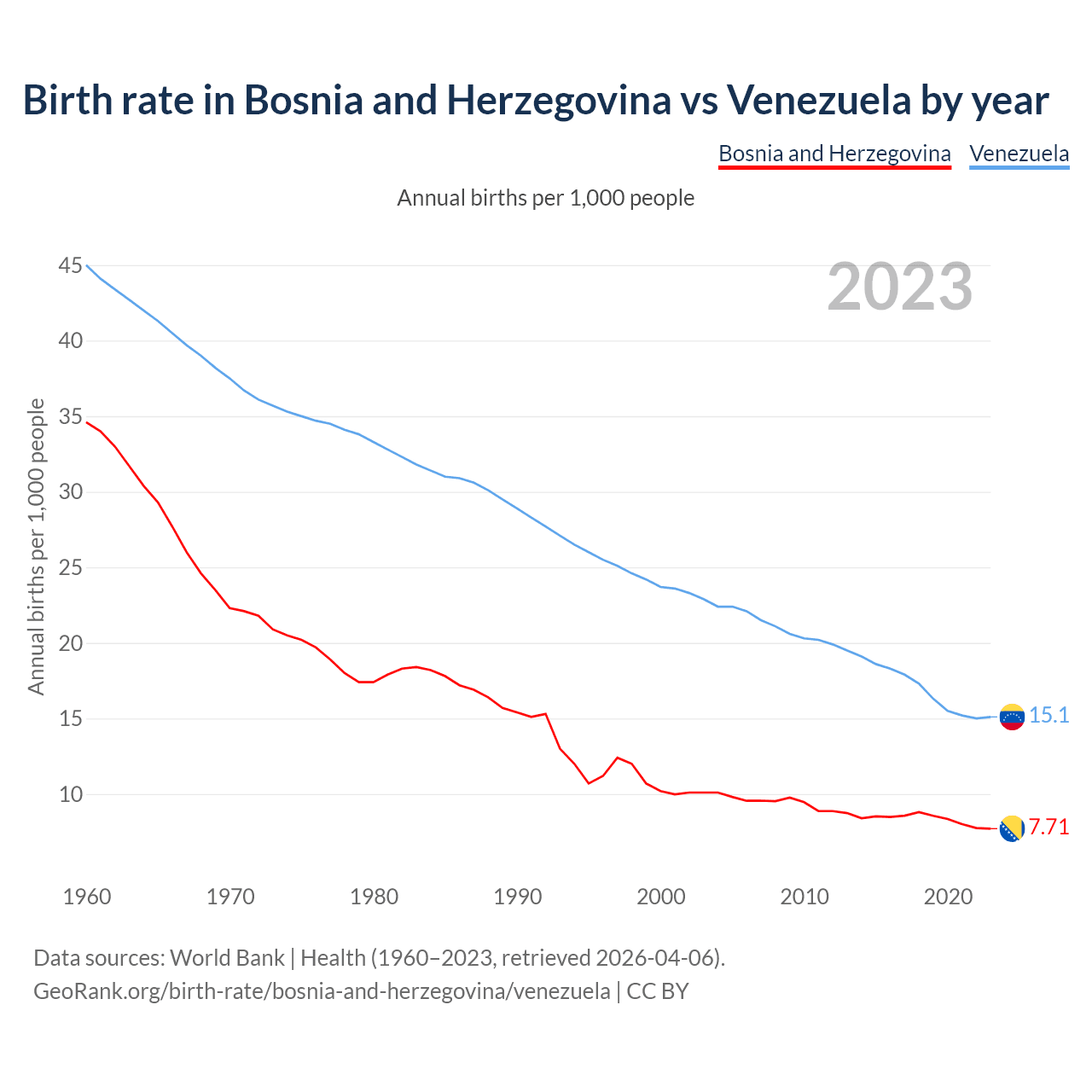 According to the latest available data on birth rates, the fertility rate in Bosnia and Herzegovina was 1.49 children per woman in 2023, compared to 2.08 in Venezuela in 2023. The replacement level is considered to be 2.1 children per woman.