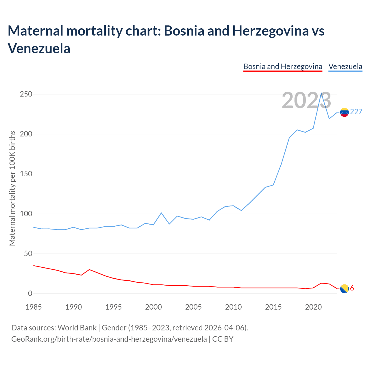 The maternal mortality rate, which is the probability of dying during childbirth or within 42 days of pregnancy termination, is 6 deaths per 100,000 live births in Bosnia and Herzegovina, compared to 227 deaths in Venezuela.