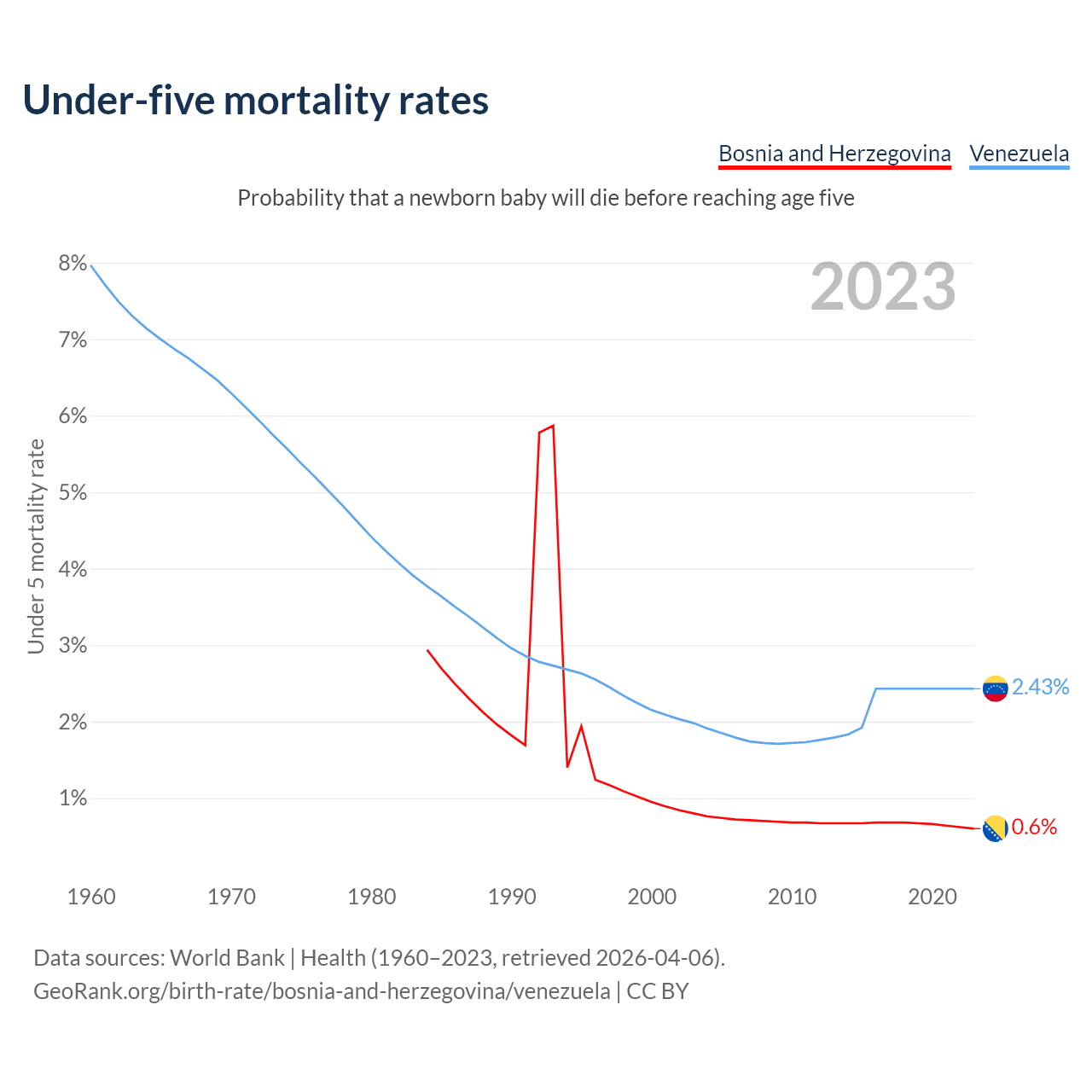 The chance that a newborn baby will die before reaching age five is 0.6% in Bosnia and Herzegovina and 2.43% in Venezuela. Above is a chart with historical data on under-five mortality rates.