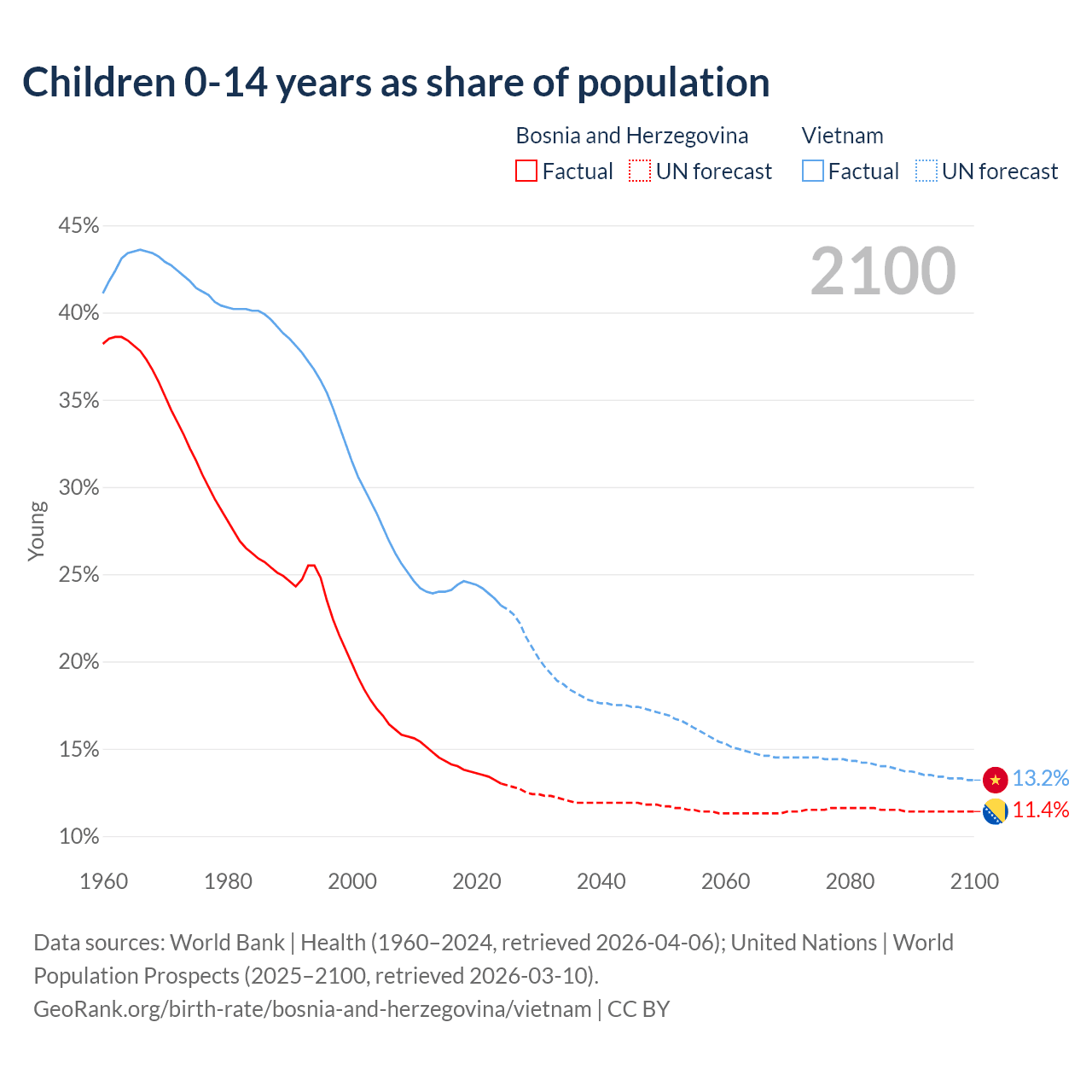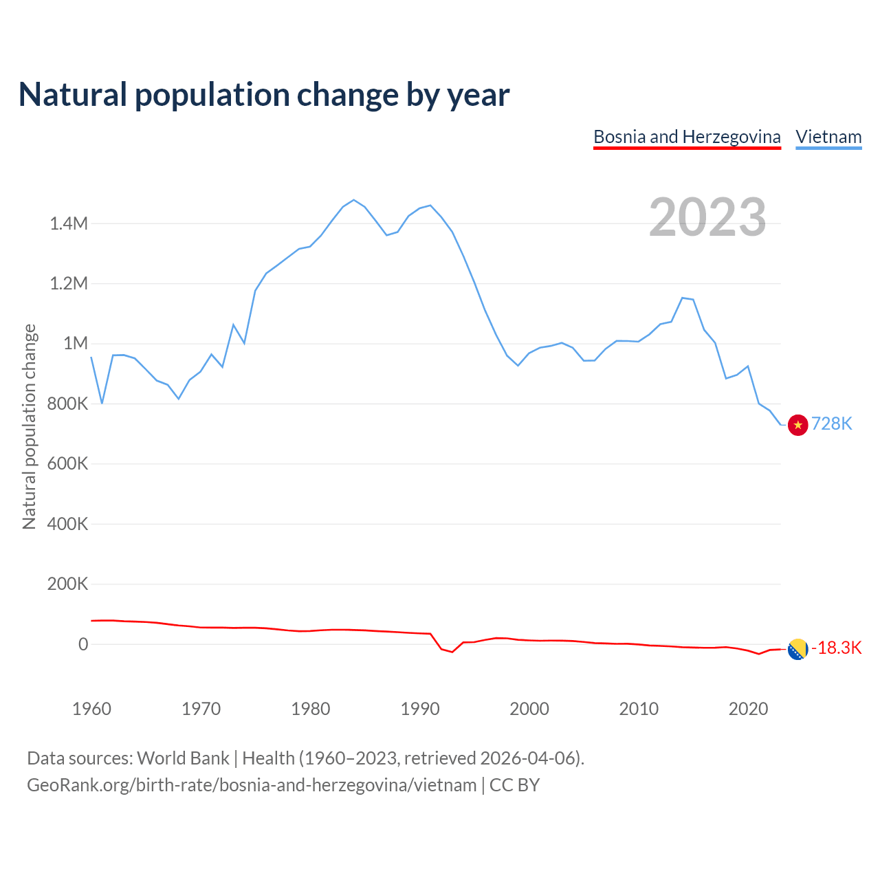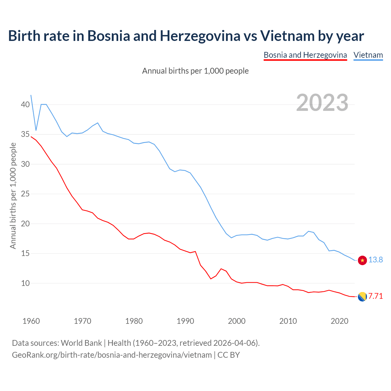 Bosnia and Herzegovina has an annual birth rate of 7.71 births per 1,000 people, compared to 13.8 for Vietnam. The average number of children a woman is expected to have during her lifetime — the fertility rate, is 1.49 in Bosnia and Herzegovina and 1.91 in Vietnam — 28.7% difference.