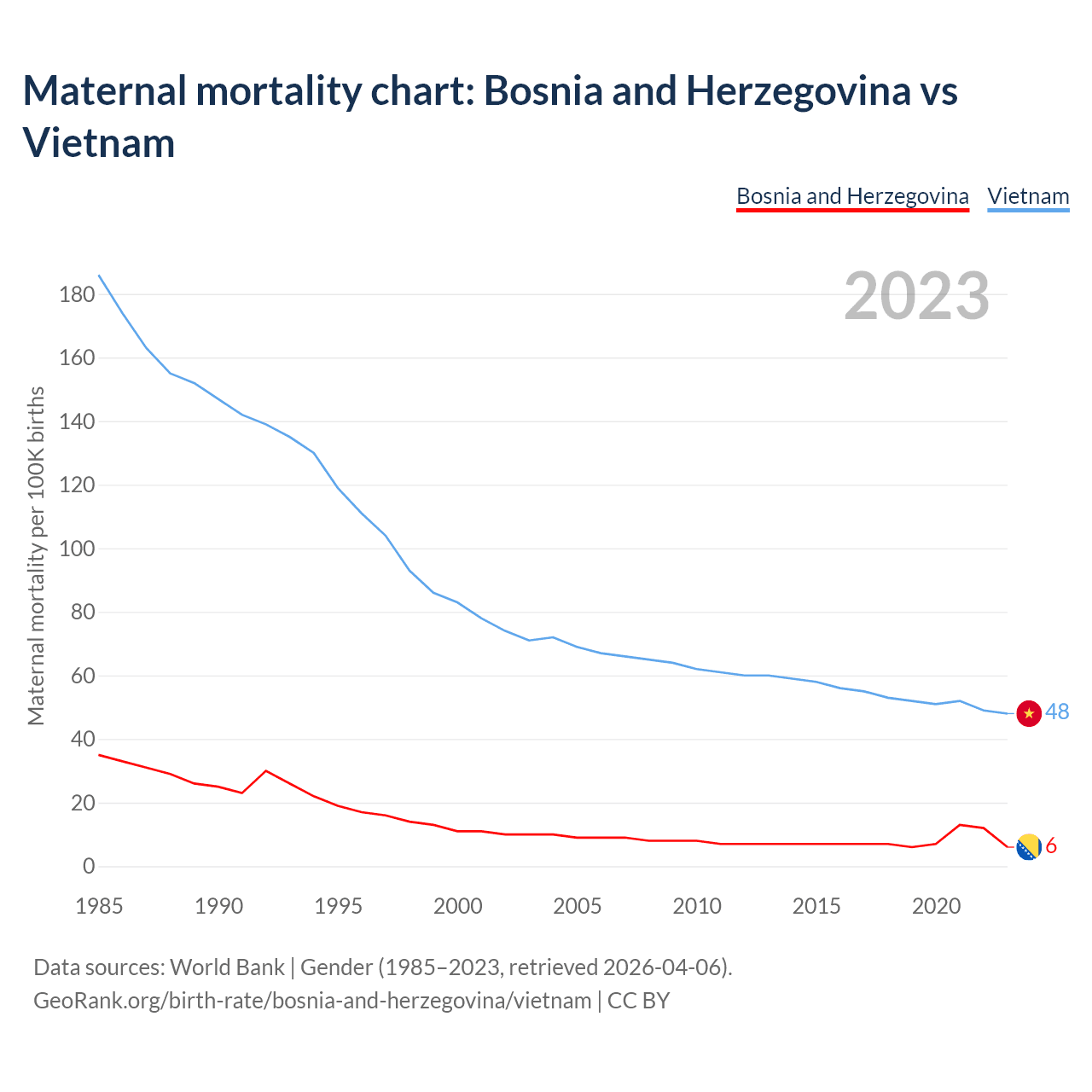 The maternal mortality rate, which is the probability of dying during childbirth or within 42 days of pregnancy termination, is 6 deaths per 100,000 live births in Bosnia and Herzegovina, compared to 48 deaths in Vietnam.