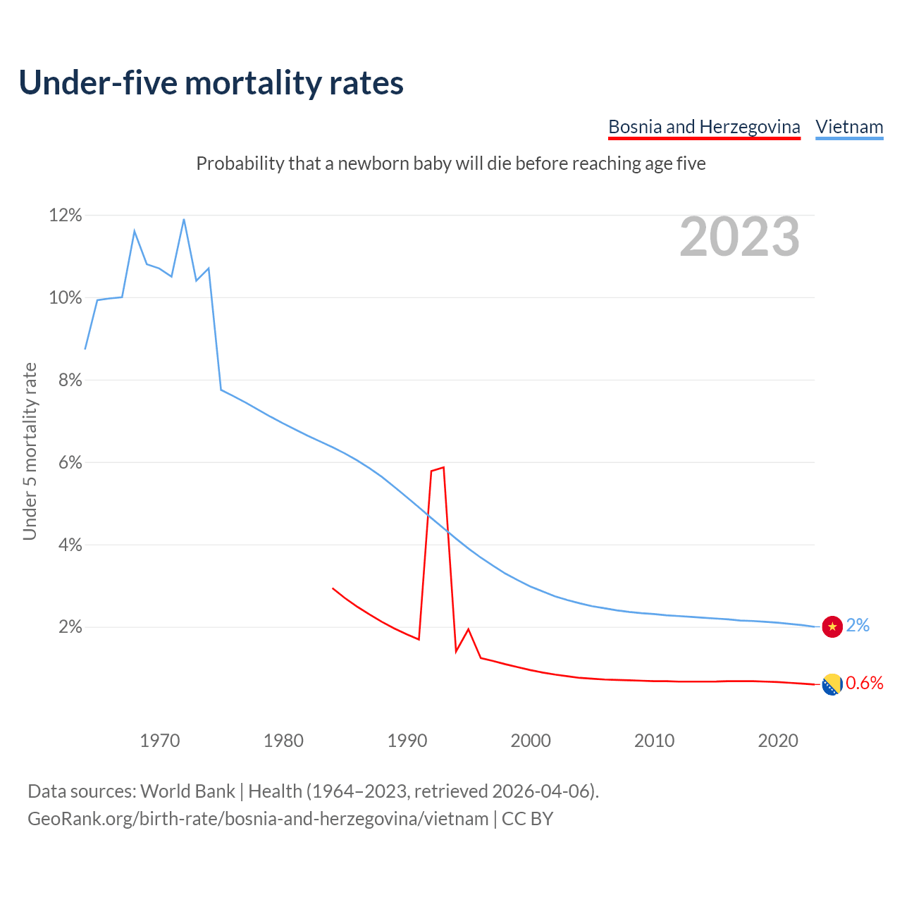The chance that a newborn baby will die before reaching age five is 0.6% in Bosnia and Herzegovina and 2% in Vietnam. Above is a chart with historical data on under-five mortality rates.