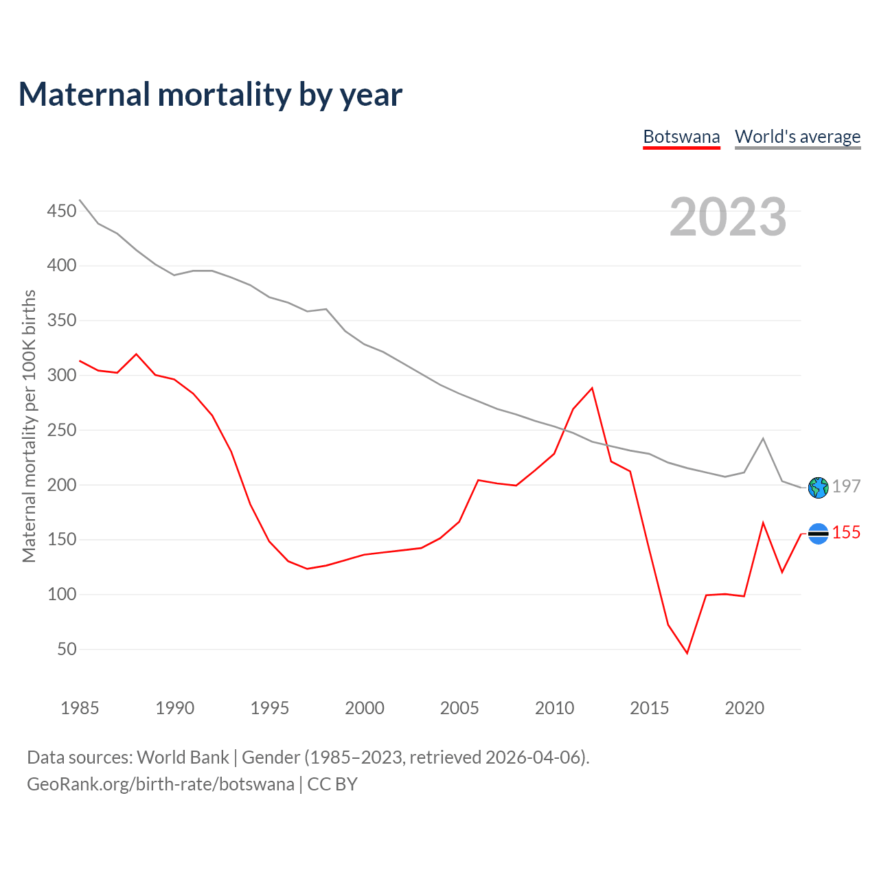 The maternal mortality rate in Botswana was 155 deaths per 100,000 live births in 2023 — a 0.16% chance of dying during childbirth or within 42 days of pregnancy termination. This is a 14% increase compared to the year 2000.