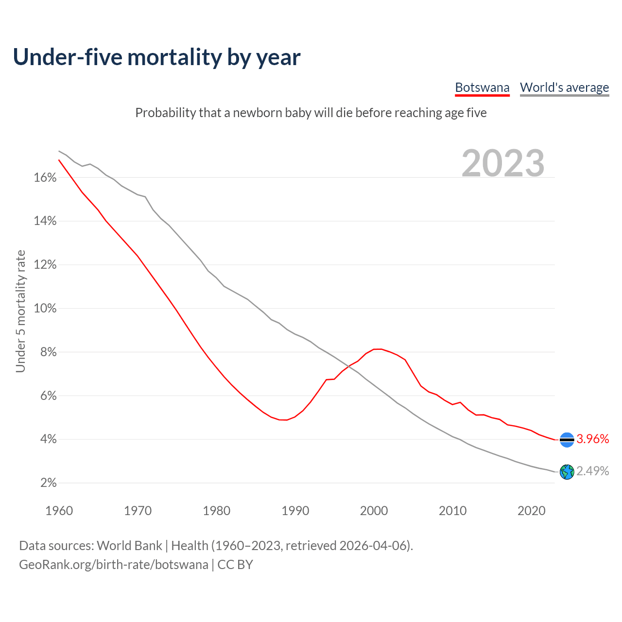 The under-5 mortality rate in Botswana was 39.6 deaths per 1,000 live births in 2023 — a 3.96% chance that a newborn baby will die before reaching age five. This is down from 81.1 deaths per 1,000 live births in 2000.