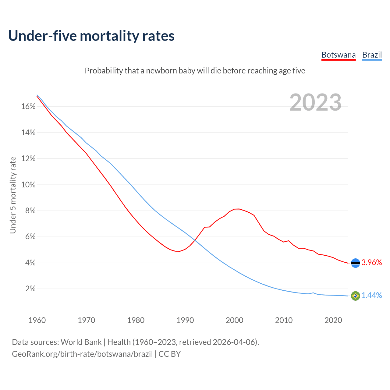 The chance that a newborn baby will die before reaching age five is 3.96% in Botswana and 1.44% in Brazil. Above is a chart with historical data on under-five mortality rates.