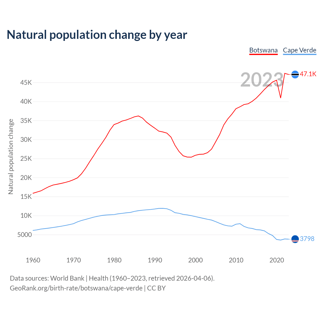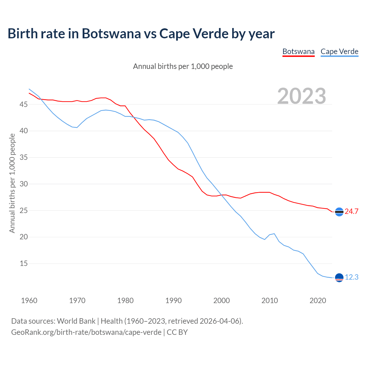 Botswana has an annual birth rate of 24.7 births per 1,000 people, compared to 12.3 for Cape Verde. The average number of children a woman is expected to have during her lifetime — the fertility rate, is 2.73 in Botswana and 1.52 in Cape Verde — 44.3% difference.