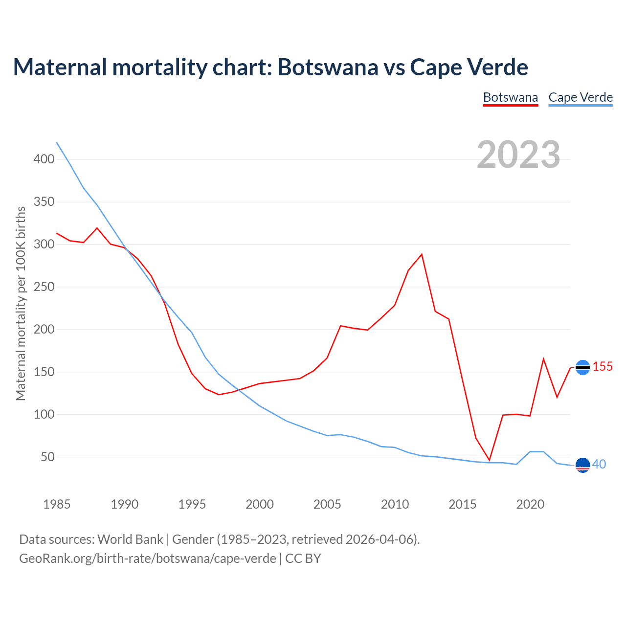 The maternal mortality rate, which is the probability of dying during childbirth or within 42 days of pregnancy termination, is 155 deaths per 100,000 live births in Botswana, compared to 40 deaths in Cape Verde.