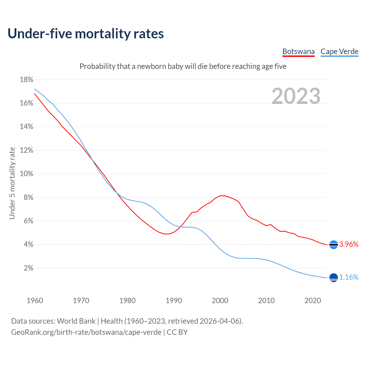 The chance that a newborn baby will die before reaching age five is 3.96% in Botswana and 1.16% in Cape Verde. Above is a chart with historical data on under-five mortality rates.