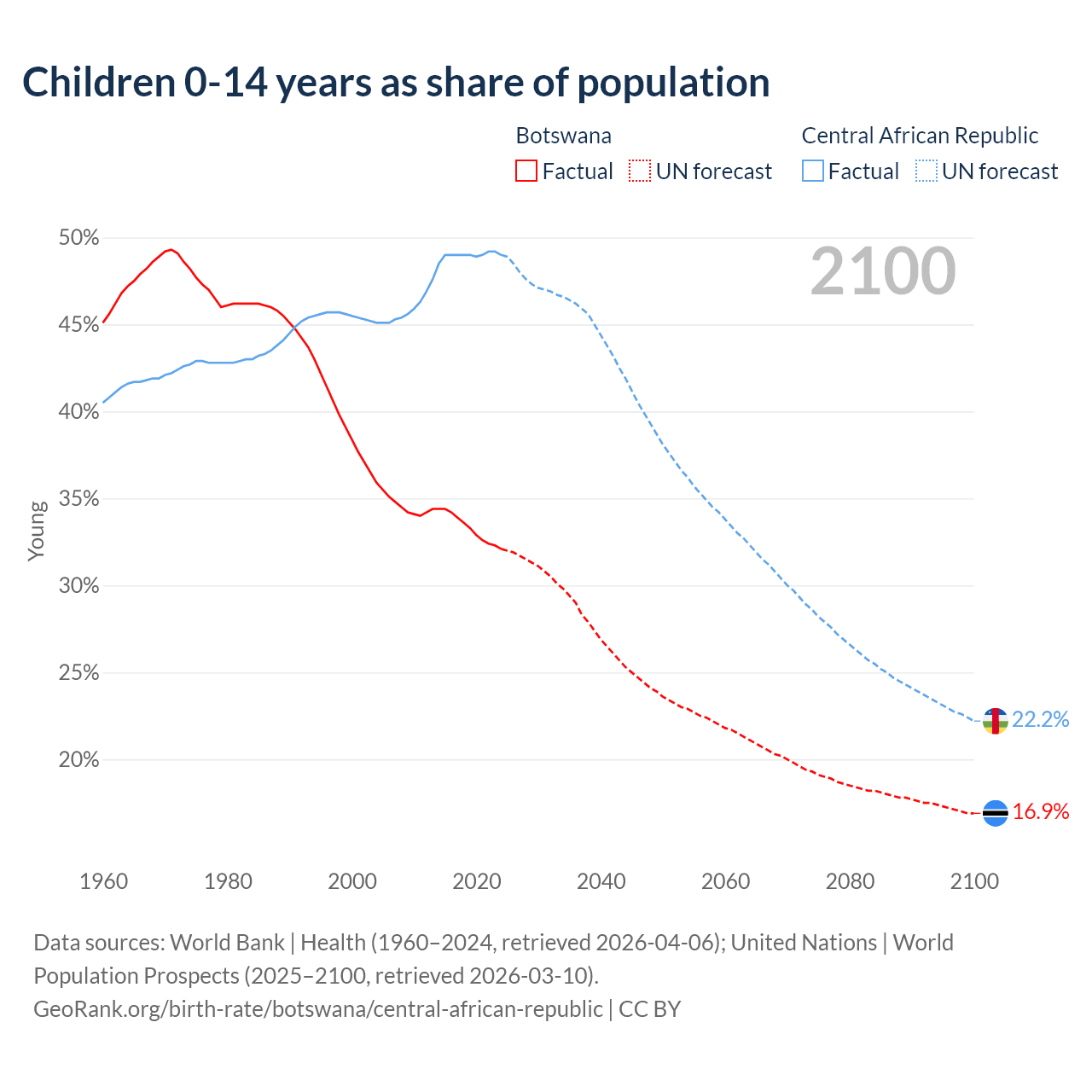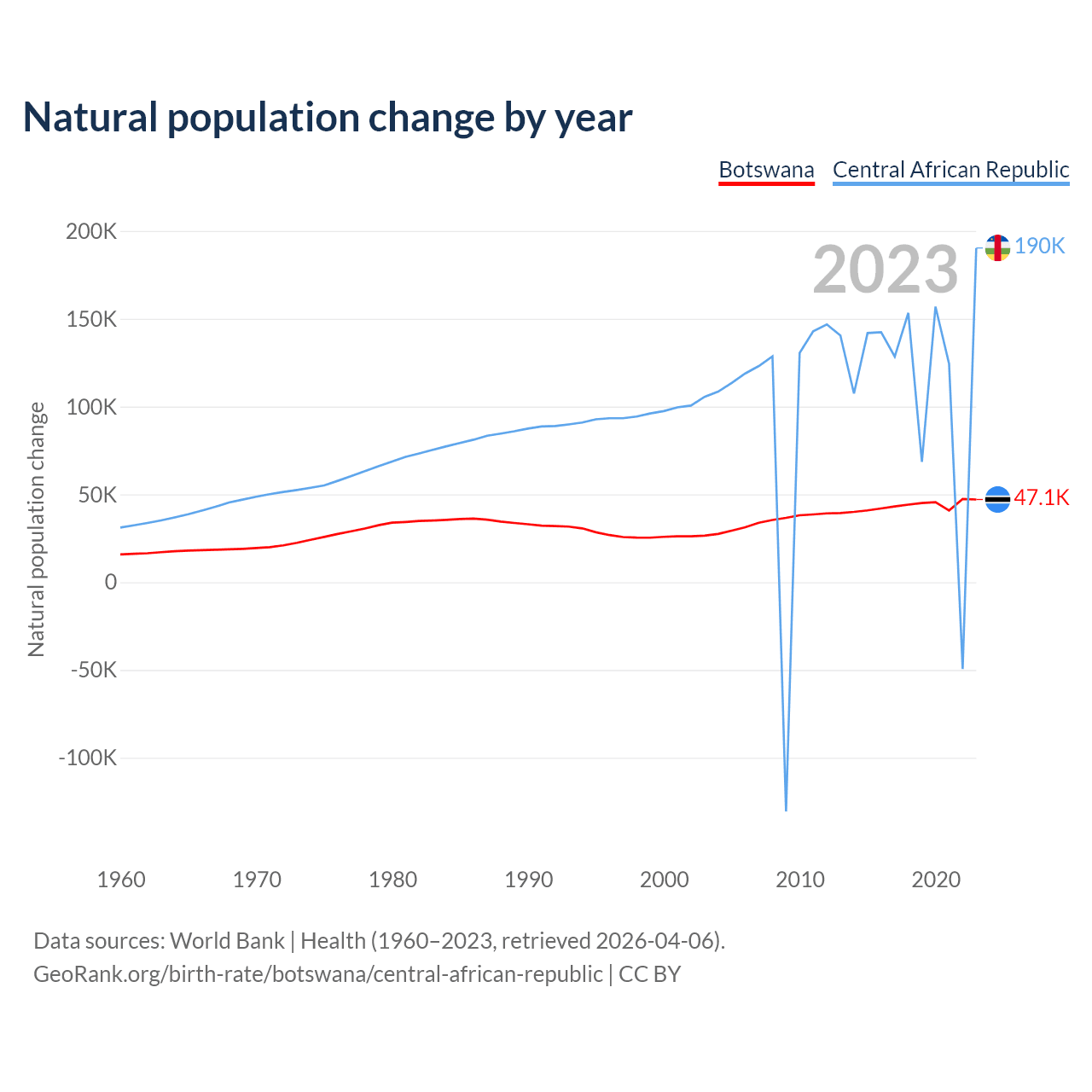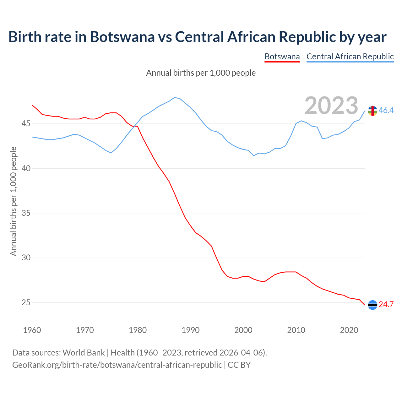 Botswana has an annual birth rate of 24.7 births per 1,000 people, compared to 46.4 for the Central African Republic. The average number of children a woman is expected to have during her lifetime — the fertility rate, is 2.73 in Botswana and 6.01 in the Central African Republic — 120.1% difference.