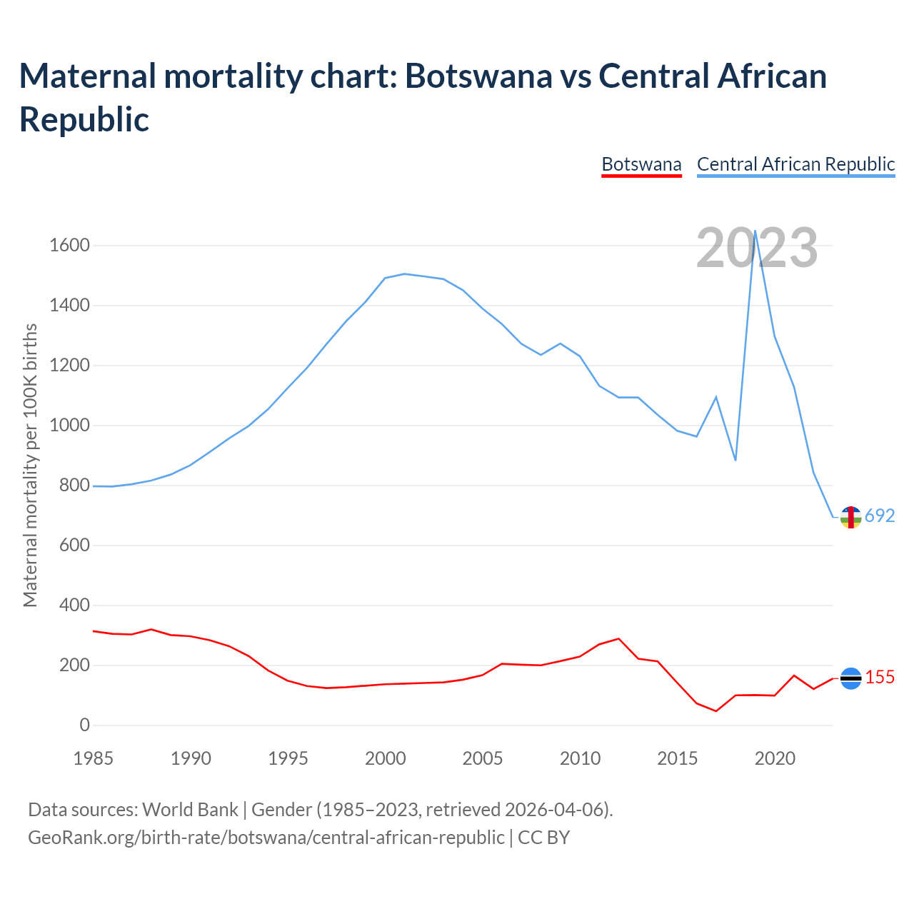 - Annual births per 1,000 women ages 15-19 (adolescent birth rate or teenage mother rate) is 53.8 in Botswana vs 163.1 in the Central African Republic.