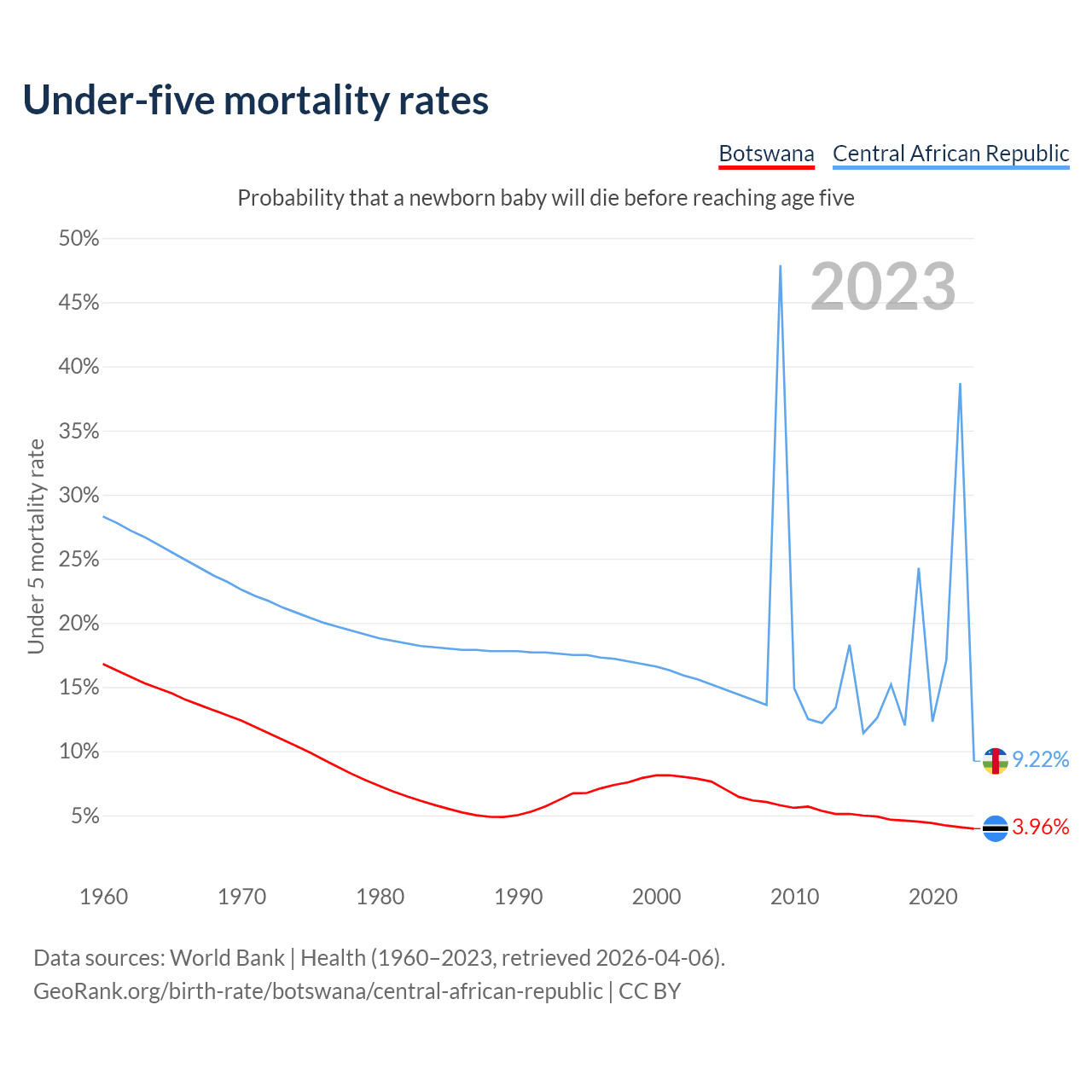 The chance that a newborn baby will die before reaching age five is 3.96% in Botswana and 9.22% in the Central African Republic. Above is a chart with historical data on under-five mortality rates.