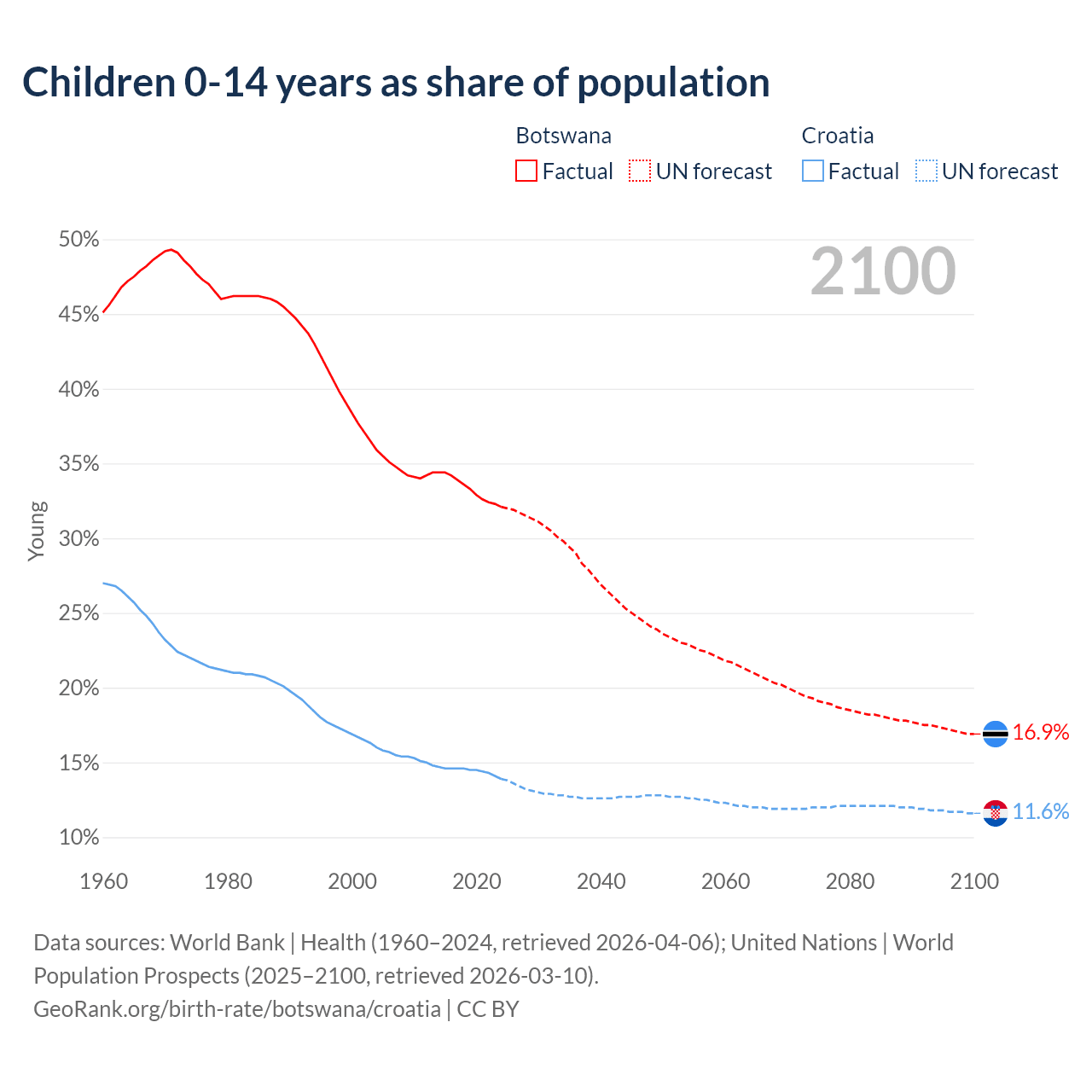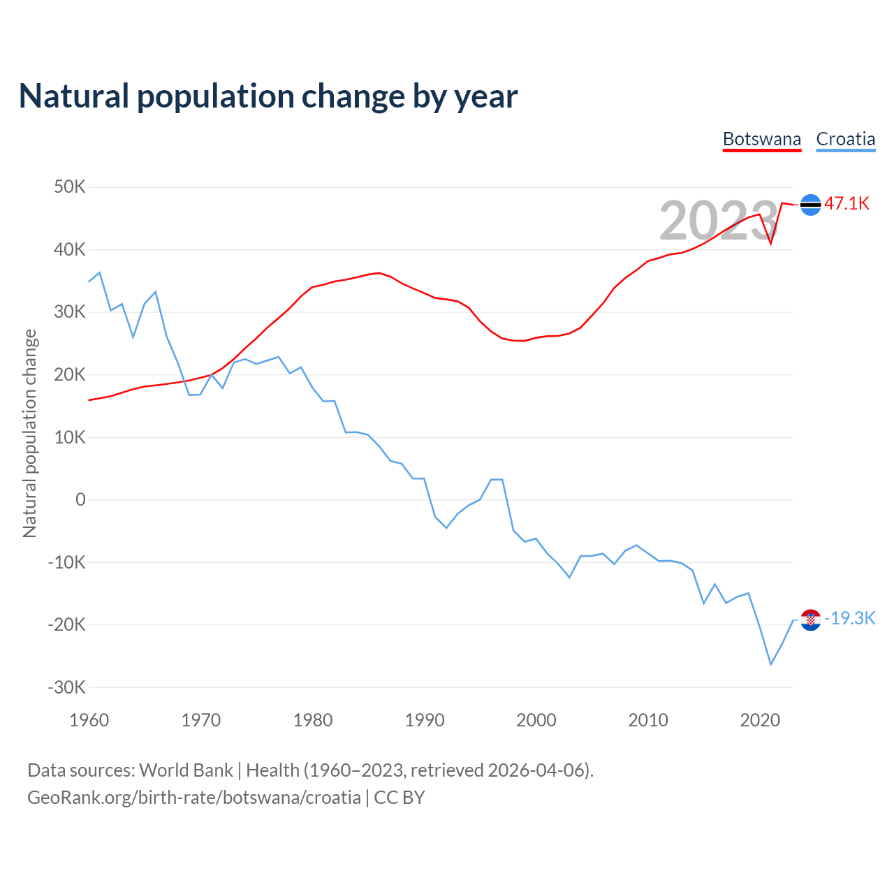 Botswana has an annual birth rate of 24.7 births per 1,000 people, compared to 8.3 for Croatia. The average number of children a woman is expected to have during her lifetime — the fertility rate, is 2.73 in Botswana and 1.46 in Croatia — 46.6% difference.