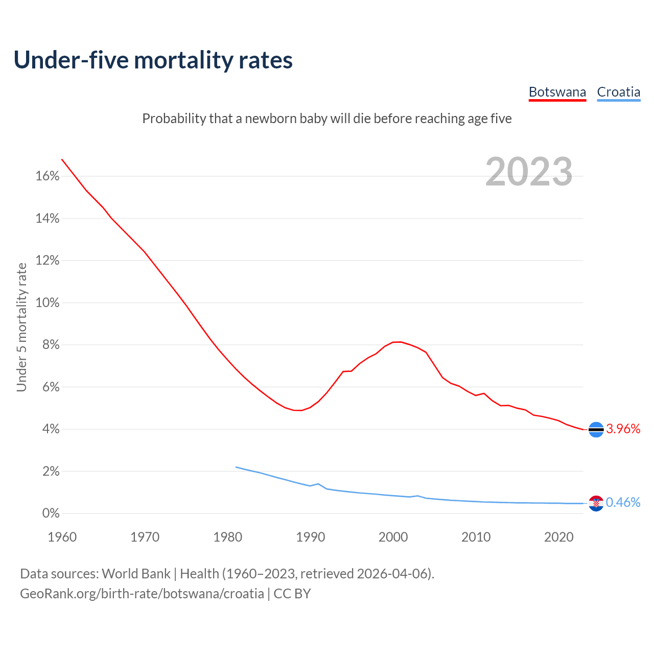 The chance that a newborn baby will die before reaching age five is 3.96% in Botswana and 0.46% in Croatia. Above is a chart with historical data on under-five mortality rates.