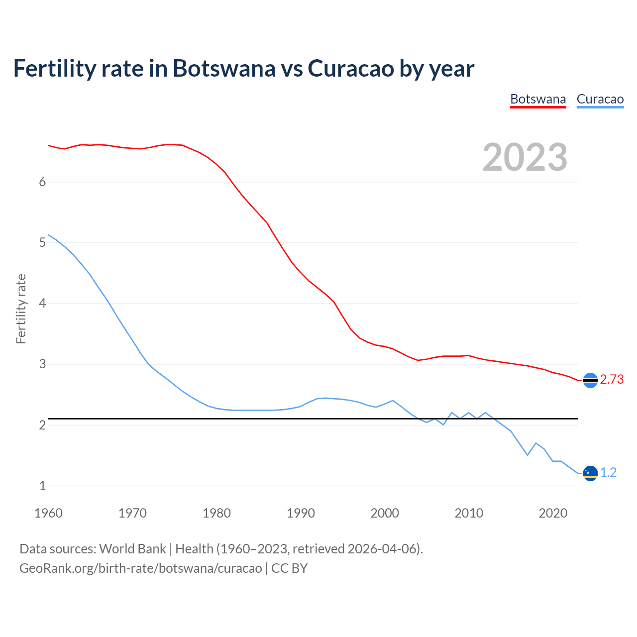 According to the latest available data on birth rates, the fertility rate in Botswana was 2.73 children per woman in 2023, compared to 1.2 in Curacao in 2023. The replacement level is considered to be 2.1 children per woman.