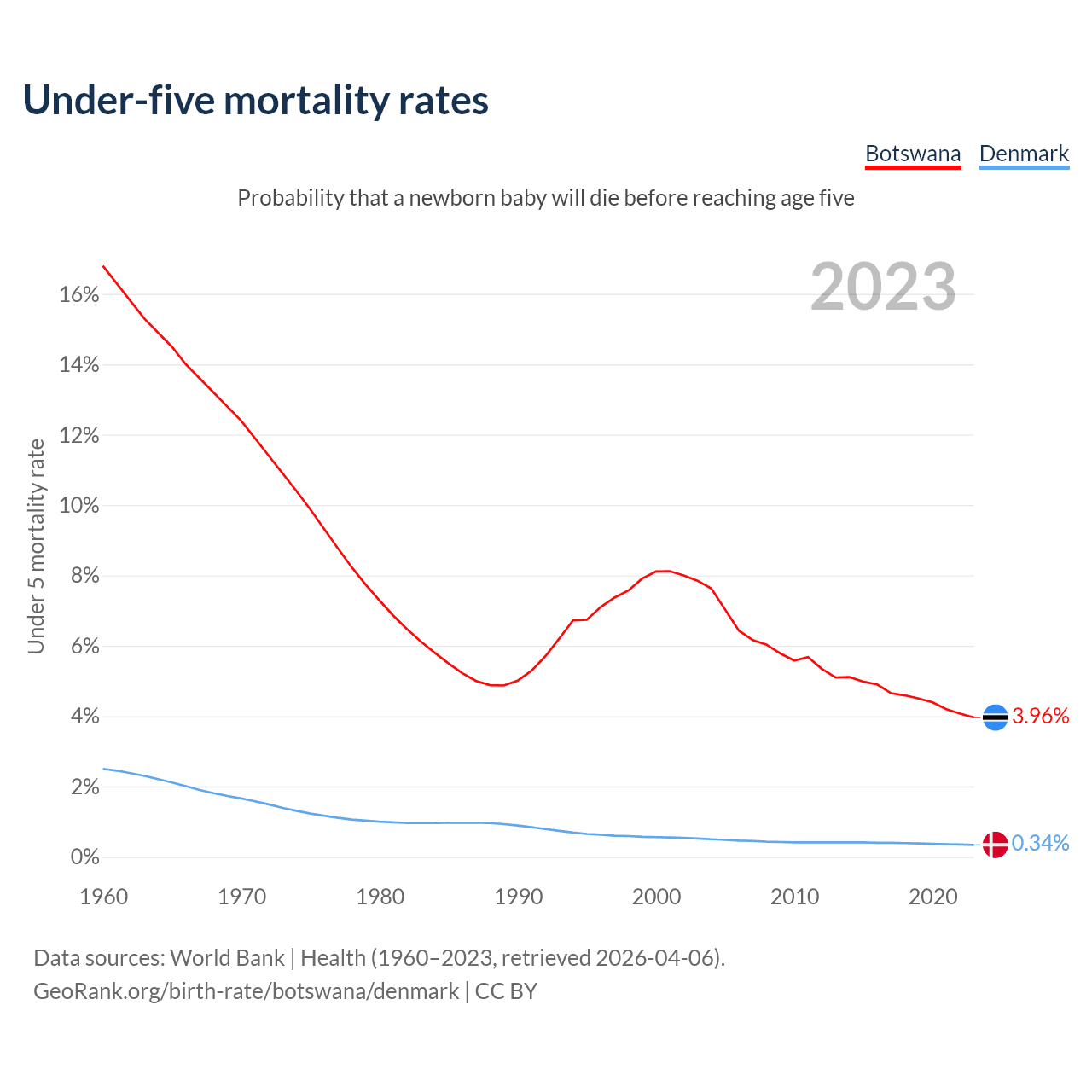 The chance that a newborn baby will die before reaching age five is 3.96% in Botswana and 0.34% in Denmark. Above is a chart with historical data on under-five mortality rates.