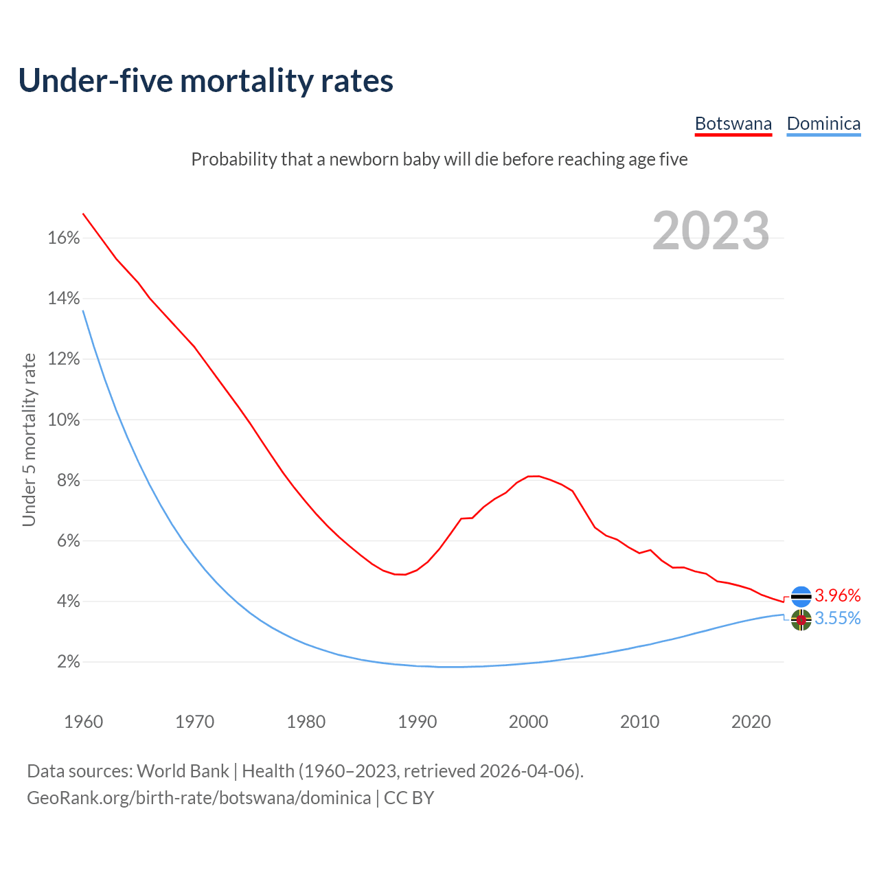 The chance that a newborn baby will die before reaching age five is 3.96% in Botswana and 3.55% in Dominica. Above is a chart with historical data on under-five mortality rates.