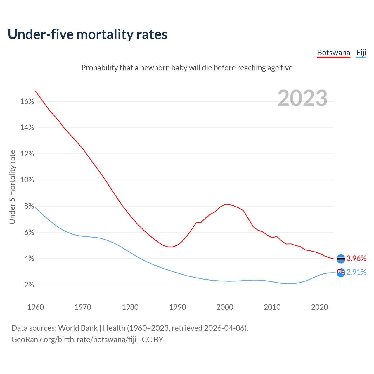 The chance that a newborn baby will die before reaching age five is 3.96% in Botswana and 2.91% in Fiji. Above is a chart with historical data on under-five mortality rates.