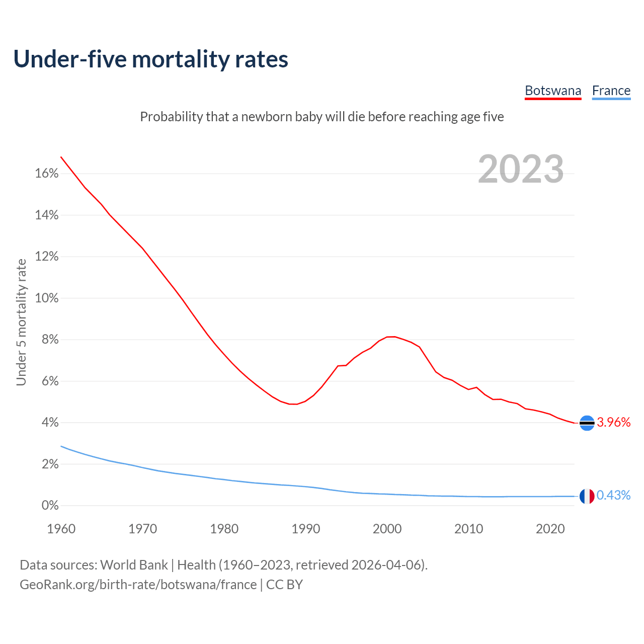 The chance that a newborn baby will die before reaching age five is 3.96% in Botswana and 0.43% in France. Above is a chart with historical data on under-five mortality rates.
