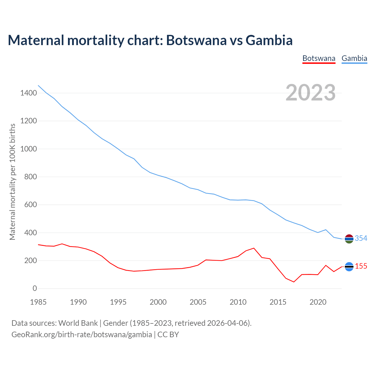 The maternal mortality rate, which is the probability of dying during childbirth or within 42 days of pregnancy termination, is 155 deaths per 100,000 live births in Botswana, compared to 354 deaths in the Gambia.