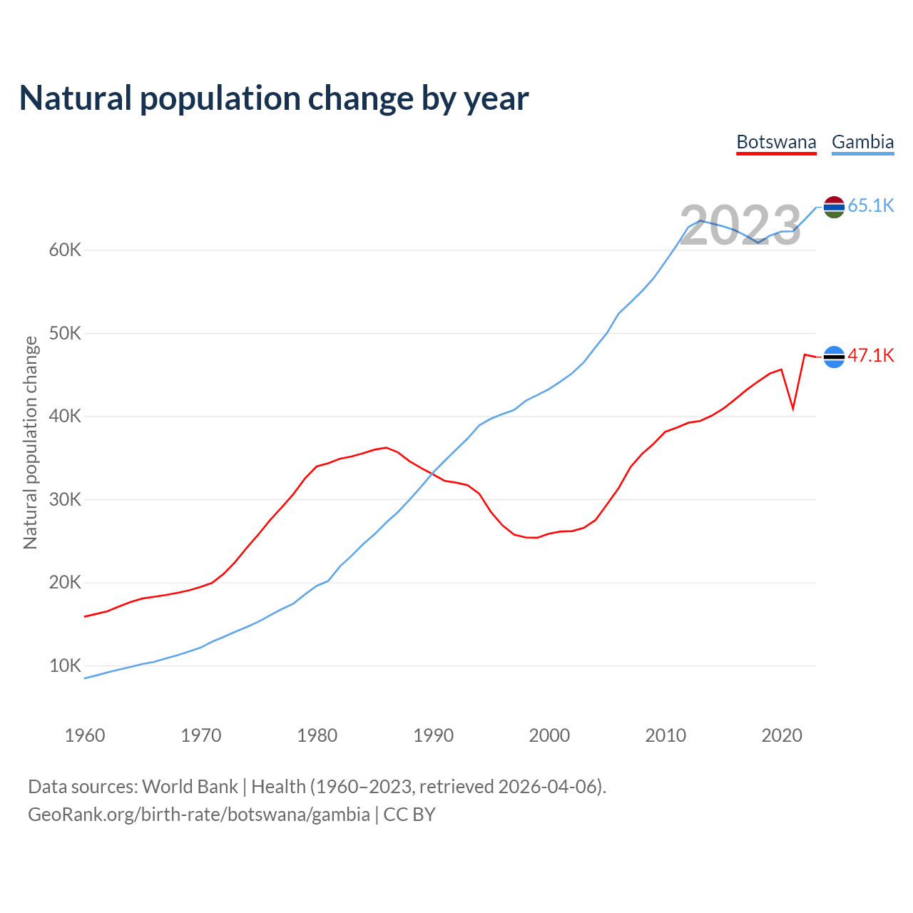 Botswana has an annual birth rate of 24.7 births per 1,000 people, compared to 30.4 for the Gambia. The average number of children a woman is expected to have during her lifetime — the fertility rate, is 2.73 in Botswana and 4.01 in the Gambia — 46.6% difference.