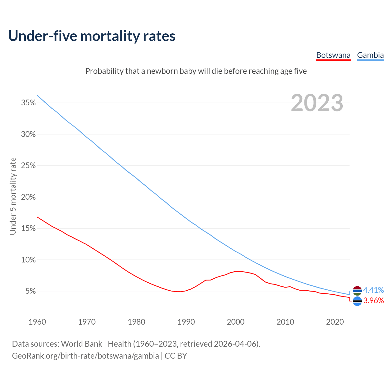 The chance that a newborn baby will die before reaching age five is 3.96% in Botswana and 4.41% in the Gambia. Above is a chart with historical data on under-five mortality rates.