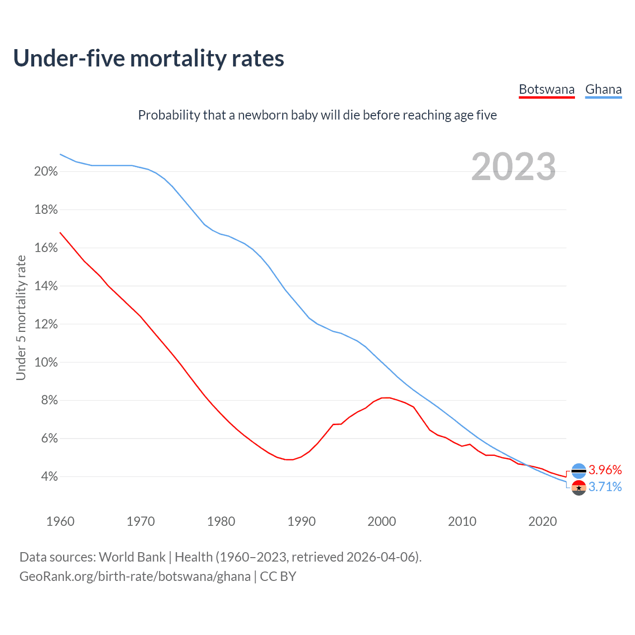 The chance that a newborn baby will die before reaching age five is 3.96% in Botswana and 3.71% in Ghana. Above is a chart with historical data on under-five mortality rates.
