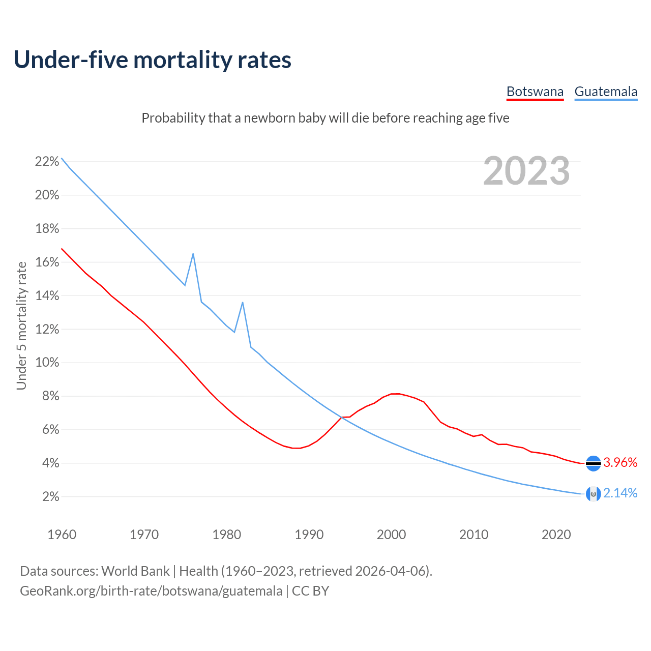 The chance that a newborn baby will die before reaching age five is 3.96% in Botswana and 2.14% in Guatemala. Above is a chart with historical data on under-five mortality rates.