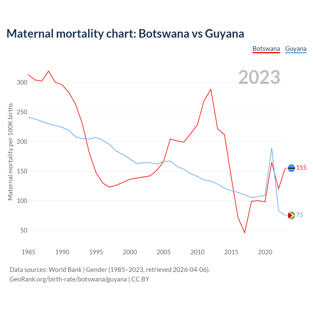 The maternal mortality rate, which is the probability of dying during childbirth or within 42 days of pregnancy termination, is 155 deaths per 100,000 live births in Botswana, compared to 75 deaths in Guyana.