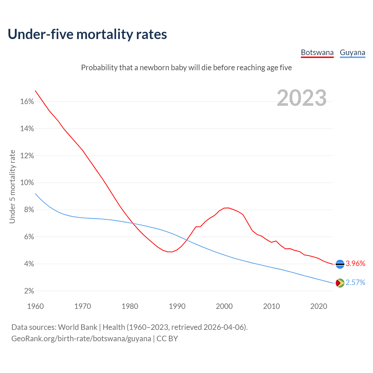The chance that a newborn baby will die before reaching age five is 3.96% in Botswana and 2.57% in Guyana. Above is a chart with historical data on under-five mortality rates.