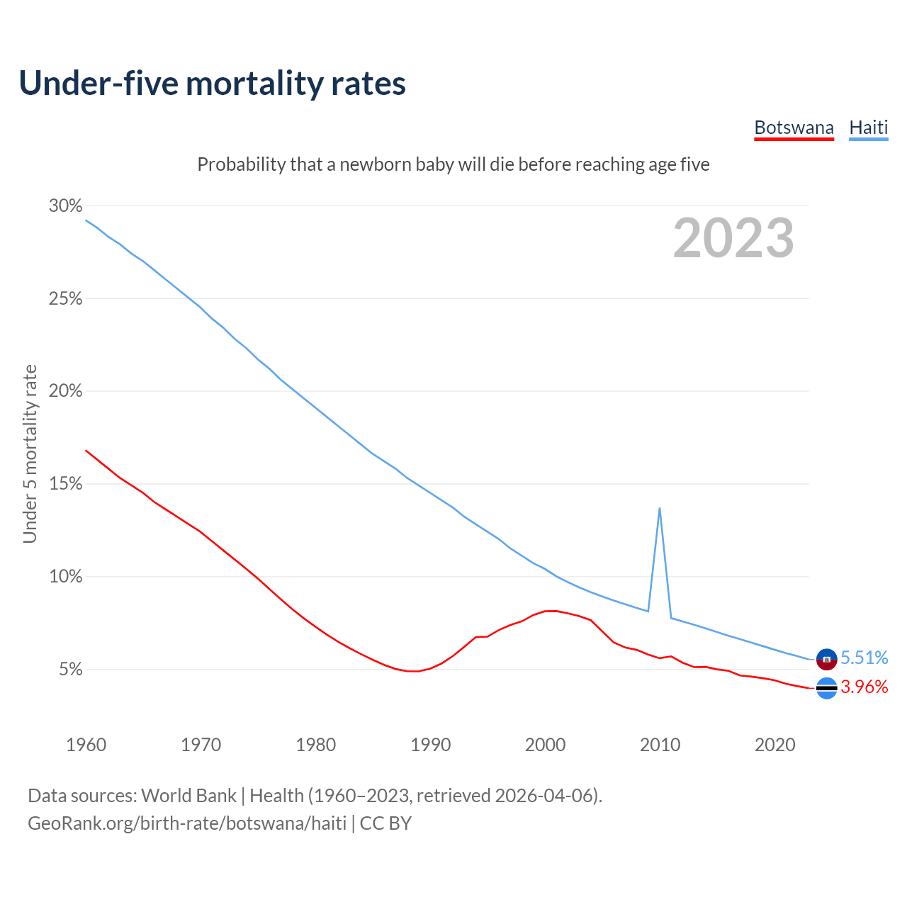 The chance that a newborn baby will die before reaching age five is 3.96% in Botswana and 5.51% in Haiti. Above is a chart with historical data on under-five mortality rates.