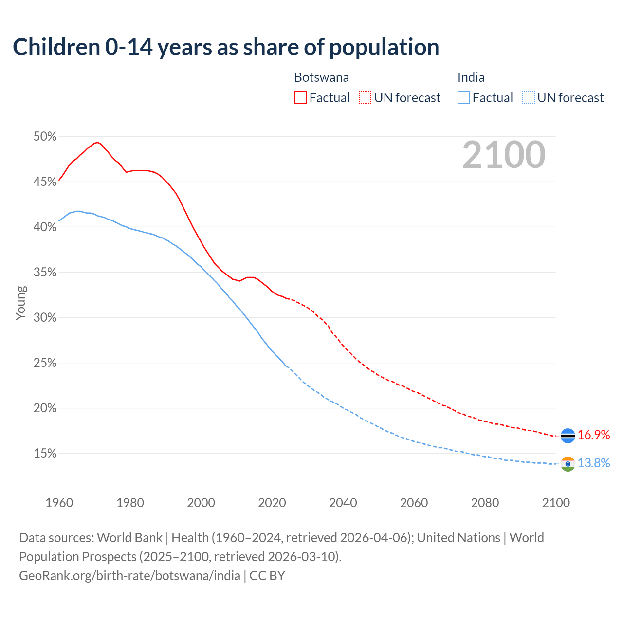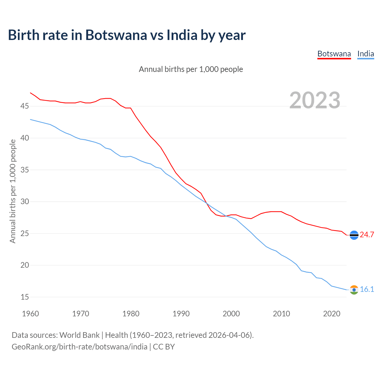 Botswana has an annual birth rate of 24.7 births per 1,000 people, compared to 16.1 for India. The average number of children a woman is expected to have during her lifetime — the fertility rate, is 2.73 in Botswana and 1.98 in India — 27.7% difference.