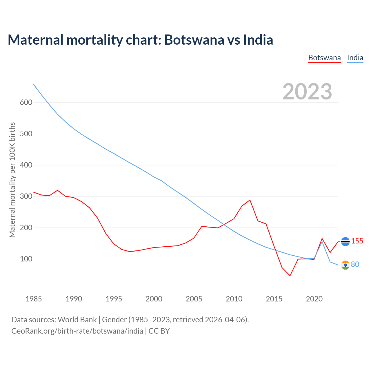 The maternal mortality rate, which is the probability of dying during childbirth or within 42 days of pregnancy termination, is 155 deaths per 100,000 live births in Botswana, compared to 80 deaths in India.