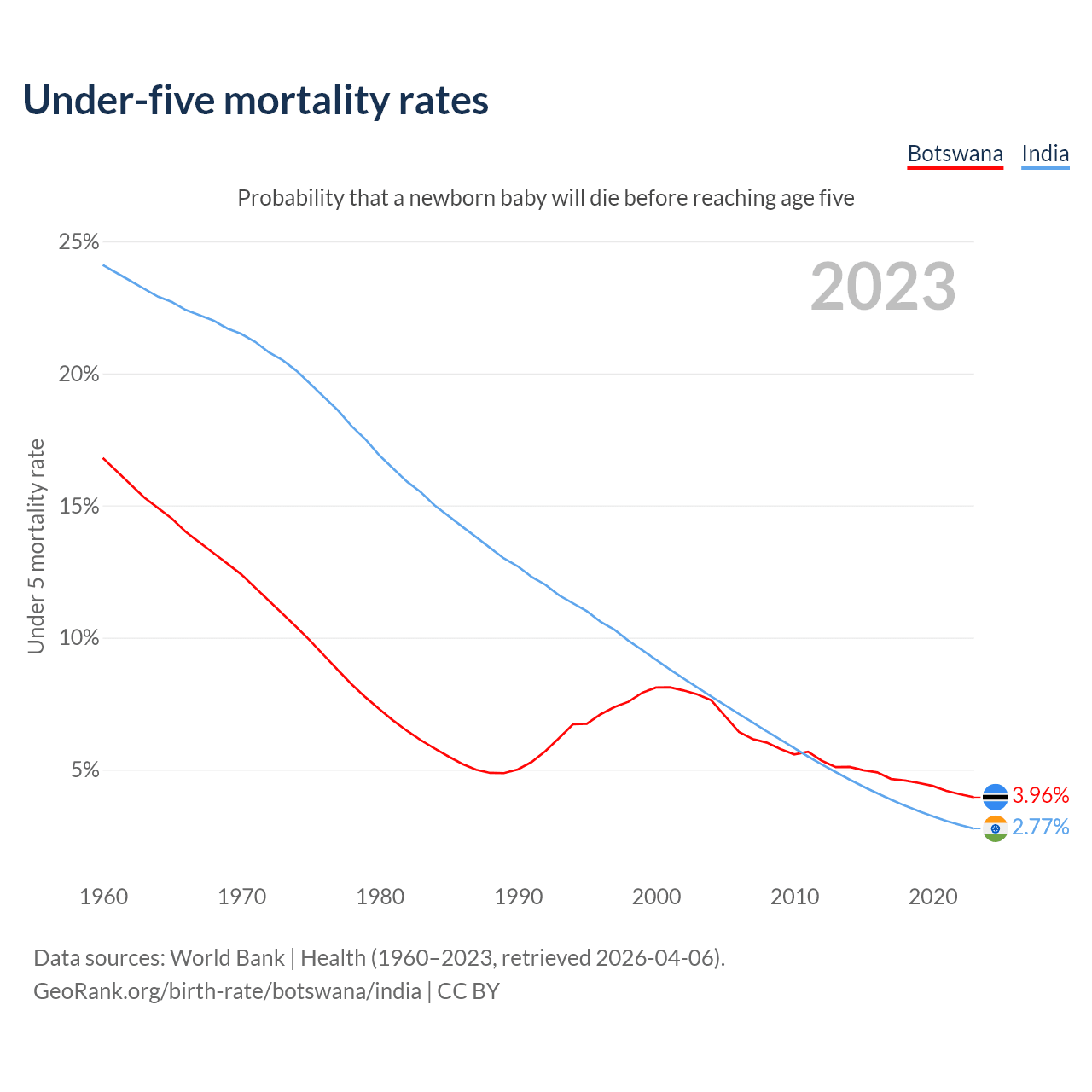 The chance that a newborn baby will die before reaching age five is 3.96% in Botswana and 2.77% in India. Above is a chart with historical data on under-five mortality rates.