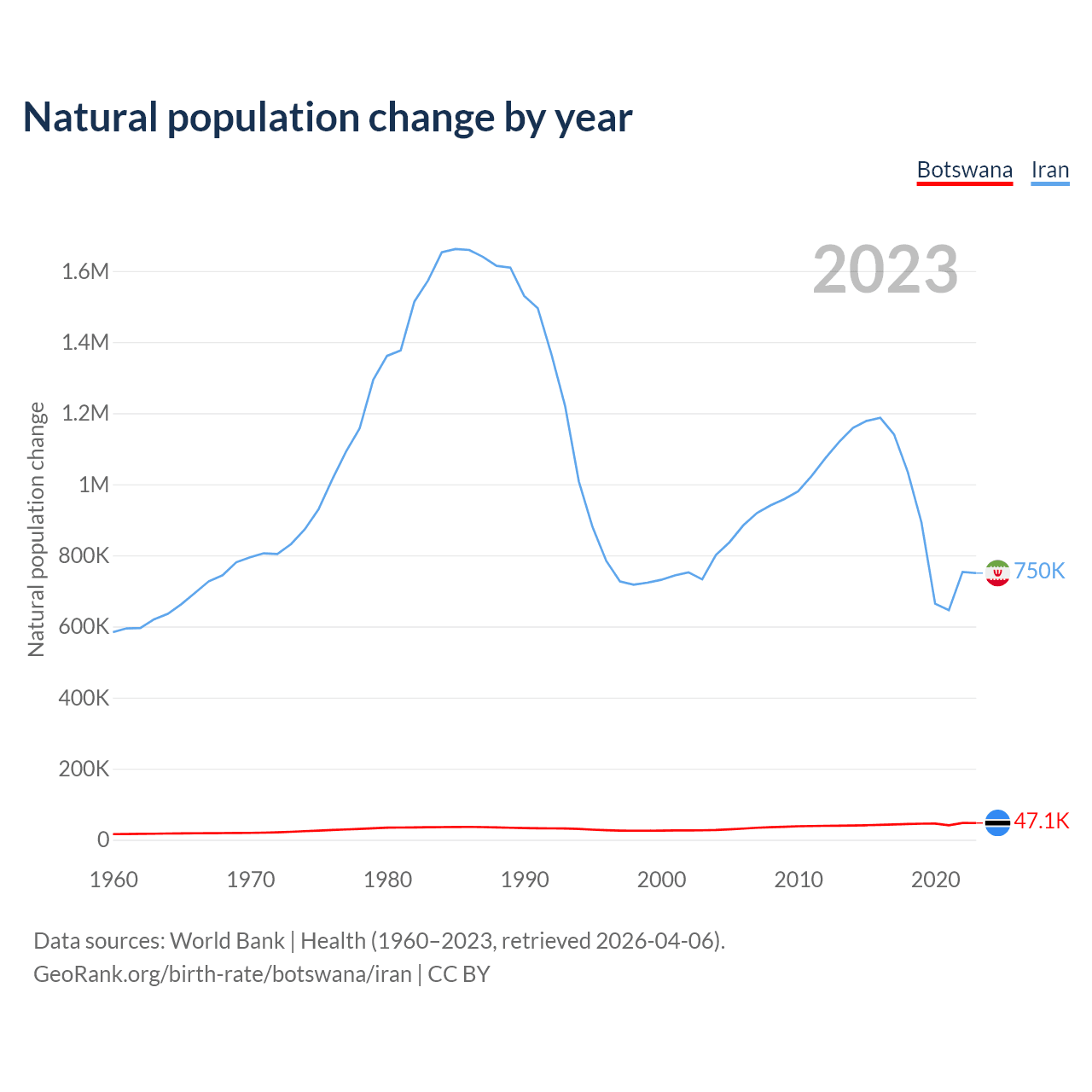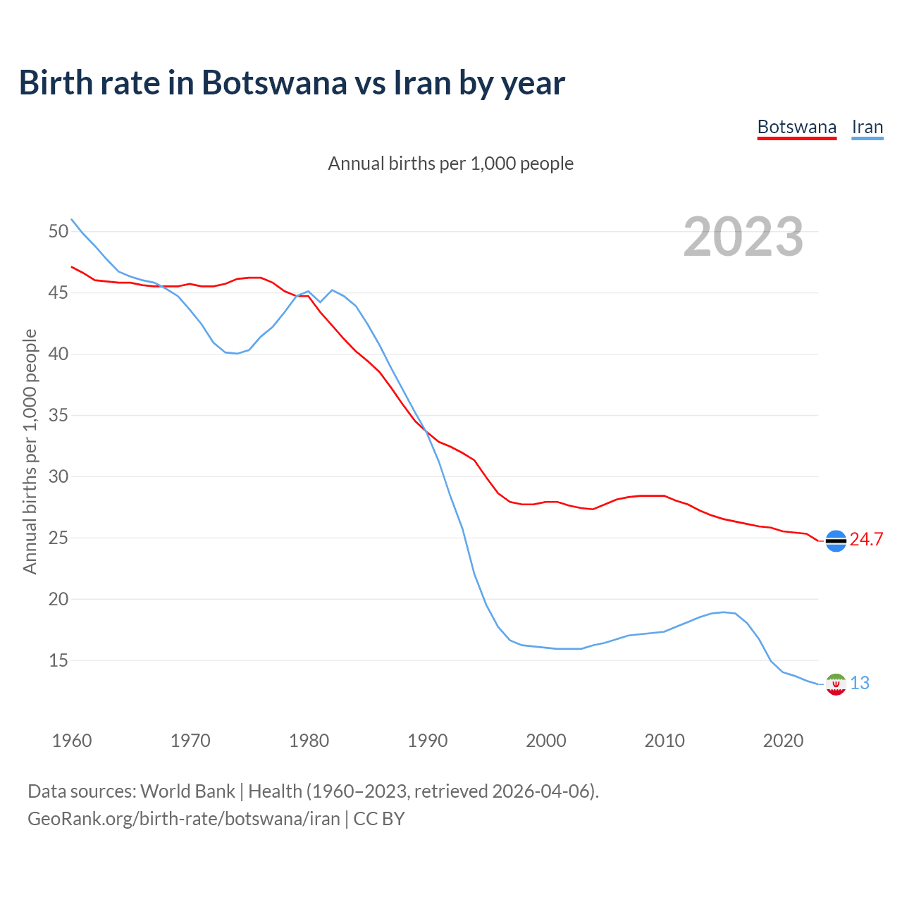 Botswana has an annual birth rate of 24.7 births per 1,000 people, compared to 13 for Iran. The average number of children a woman is expected to have during her lifetime — the fertility rate, is 2.73 in Botswana and 1.7 in Iran — 38% difference.