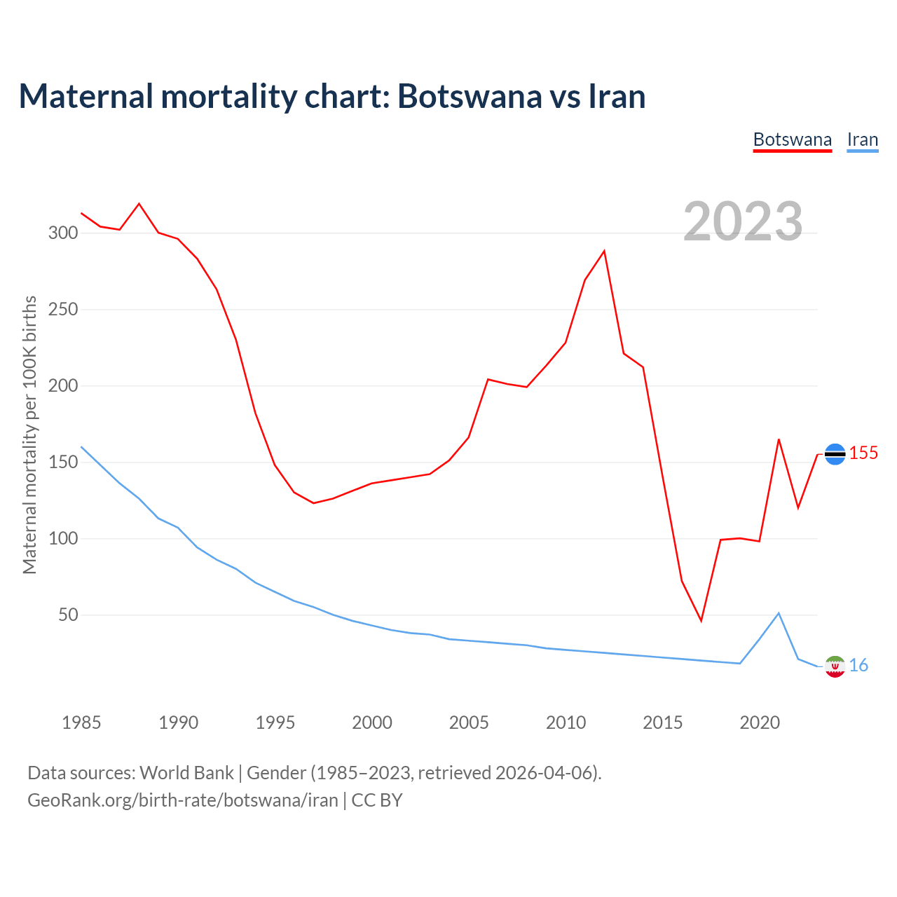 The maternal mortality rate, which is the probability of dying during childbirth or within 42 days of pregnancy termination, is 155 deaths per 100,000 live births in Botswana, compared to 16 deaths in Iran.