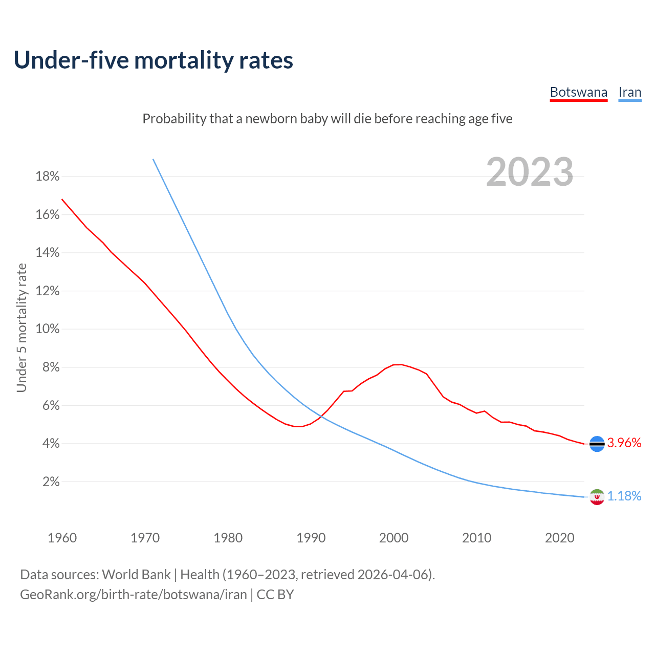 The chance that a newborn baby will die before reaching age five is 3.96% in Botswana and 1.18% in Iran. Above is a chart with historical data on under-five mortality rates.