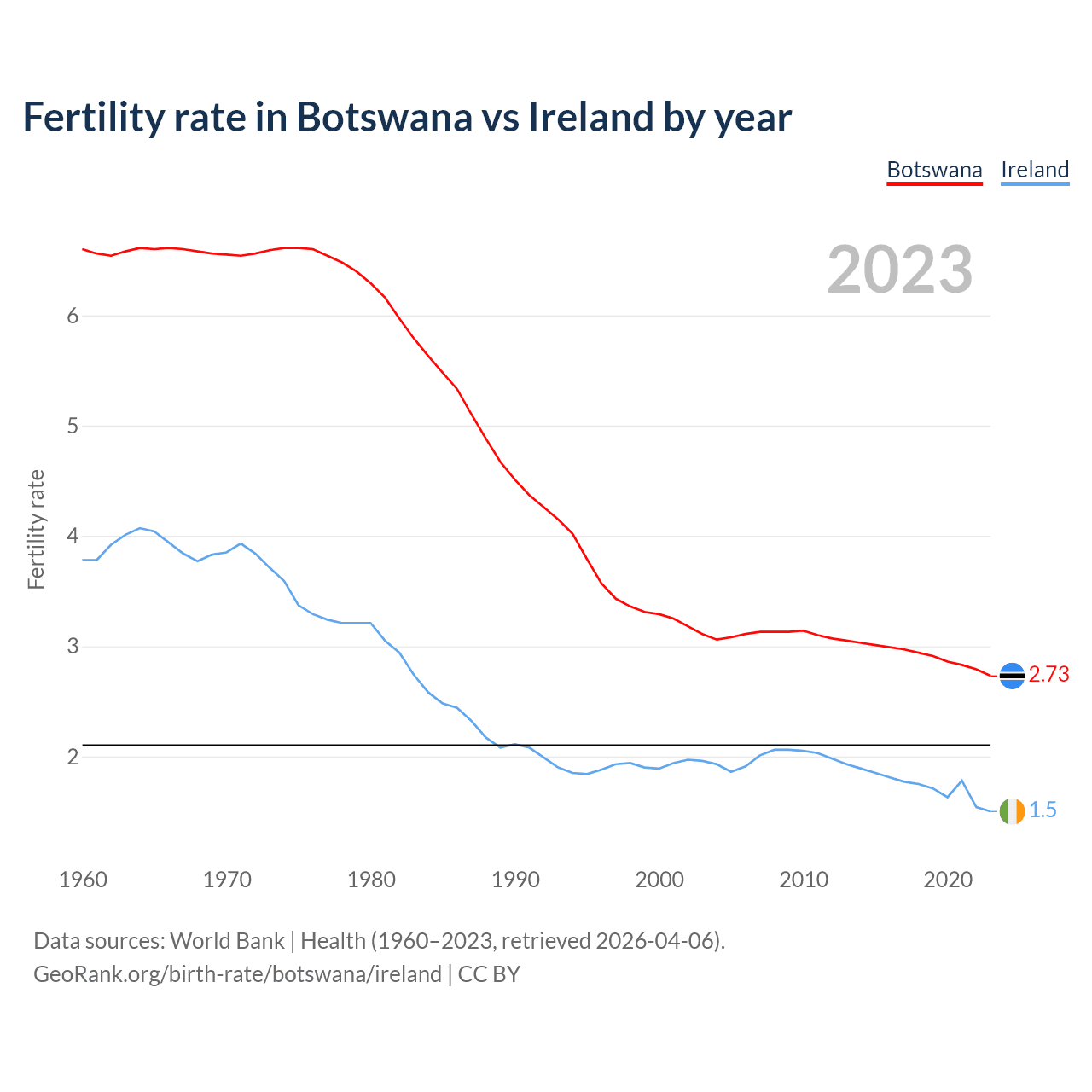 Botswana has an annual birth rate of 24.7 births per 1,000 people, compared to 10.3 for Ireland. The average number of children a woman is expected to have during her lifetime — the fertility rate, is 2.73 in Botswana and 1.5 in Ireland — 45.1% difference.