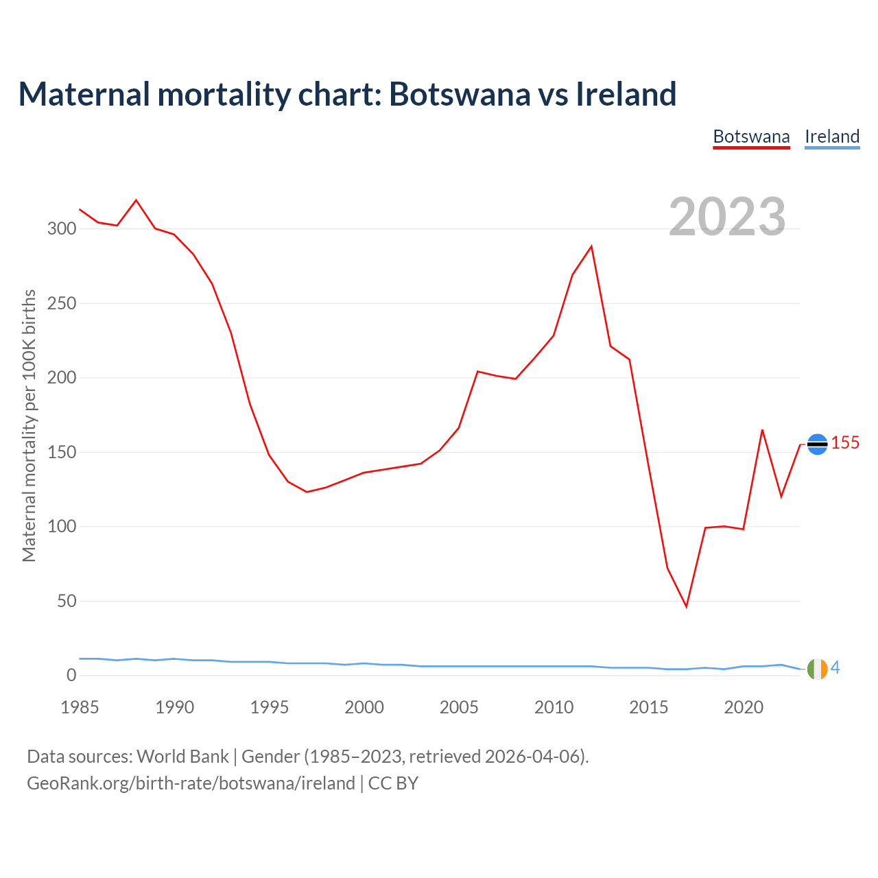 The maternal mortality rate, which is the probability of dying during childbirth or within 42 days of pregnancy termination, is 155 deaths per 100,000 live births in Botswana, compared to 4 deaths in Ireland.