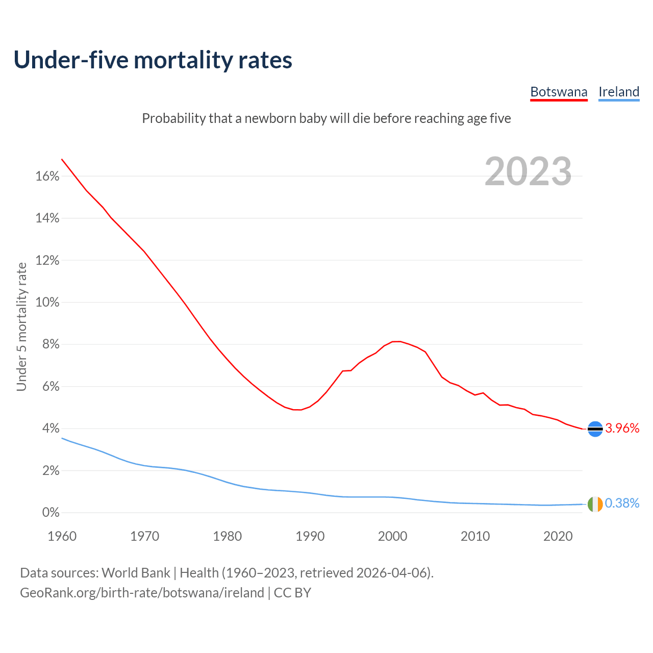 The chance that a newborn baby will die before reaching age five is 3.96% in Botswana and 0.38% in Ireland. Above is a chart with historical data on under-five mortality rates.