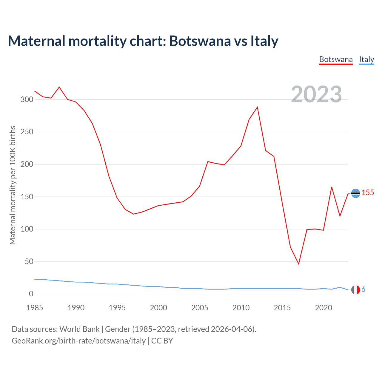 The maternal mortality rate, which is the probability of dying during childbirth or within 42 days of pregnancy termination, is 155 deaths per 100,000 live births in Botswana, compared to 6 deaths in Italy.