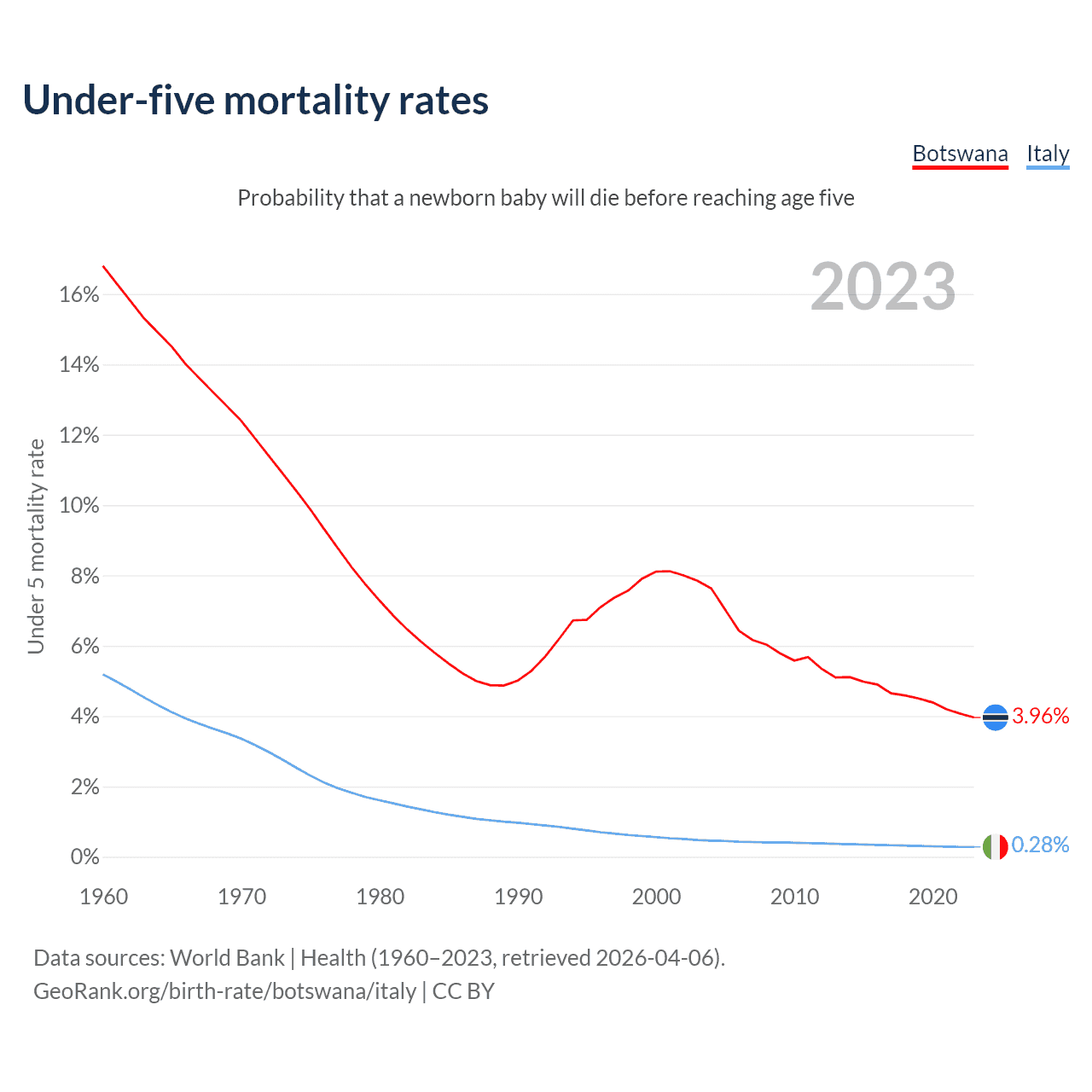 The chance that a newborn baby will die before reaching age five is 3.96% in Botswana and 0.28% in Italy. Above is a chart with historical data on under-five mortality rates.