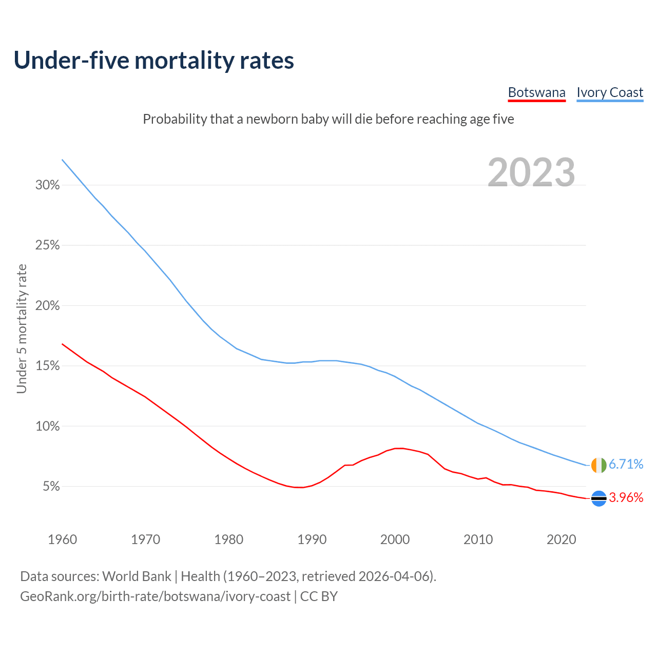 The chance that a newborn baby will die before reaching age five is 3.96% in Botswana and 6.71% in Ivory Coast. Above is a chart with historical data on under-five mortality rates.