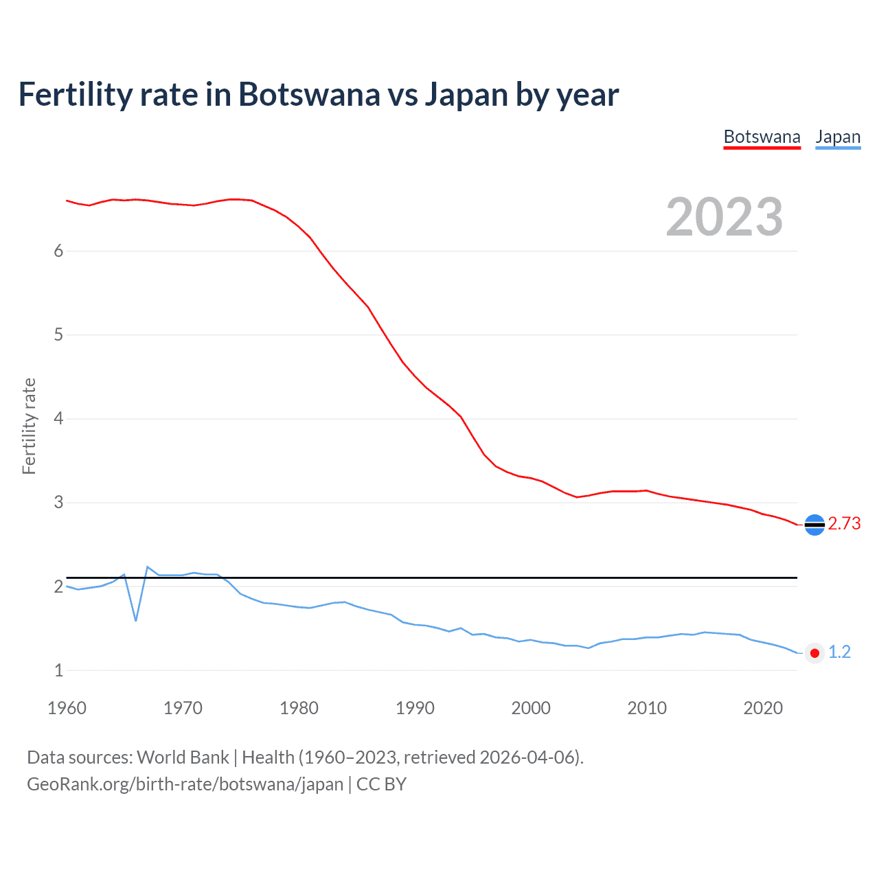 1960 vs 2023, the fertility rate has decreased by 58.6% in Botswana and by 40% in Japan — in 1960, it was 6.6 and 2, respectively.