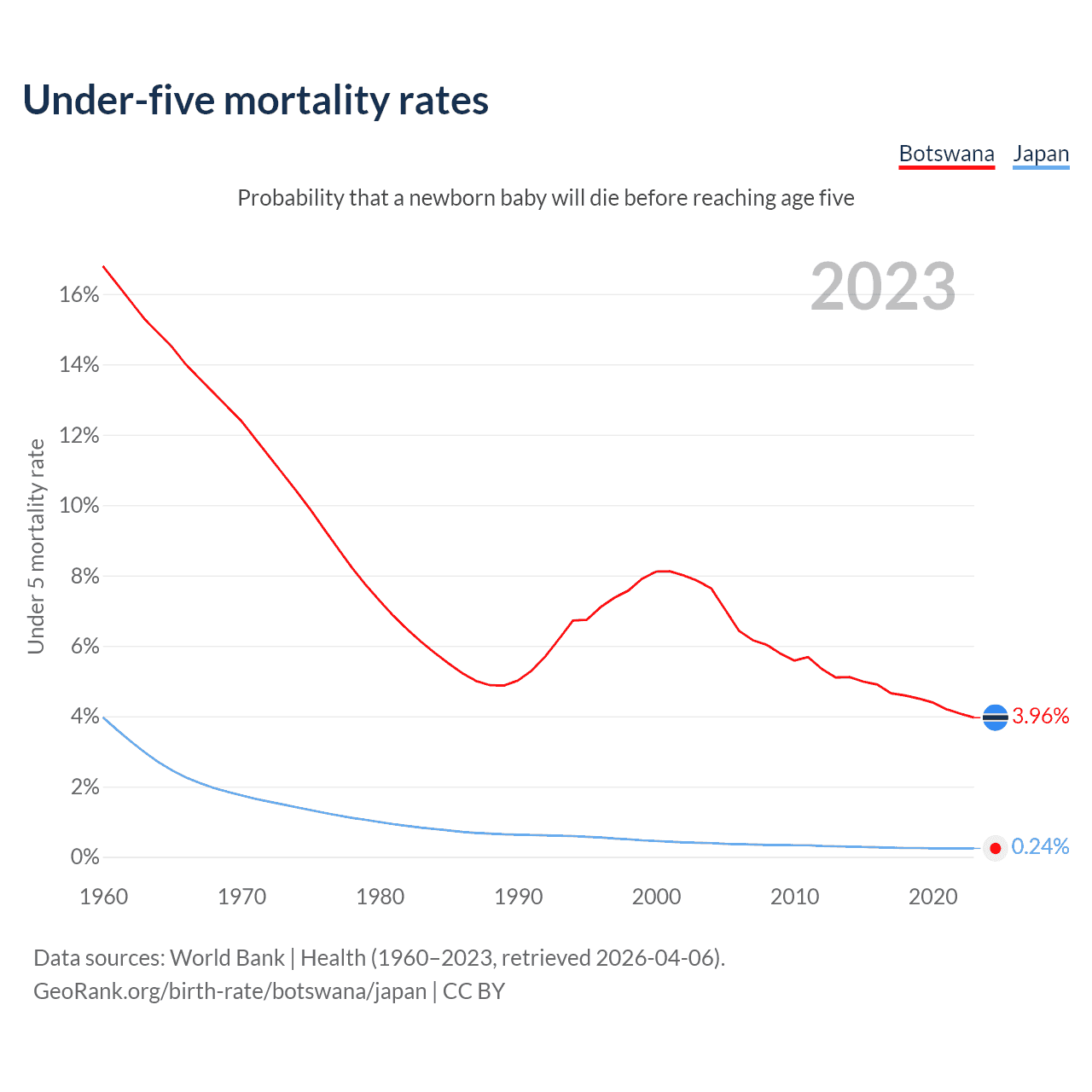 The chance that a newborn baby will die before reaching age five is 3.96% in Botswana and 0.24% in Japan. Above is a chart with historical data on under-five mortality rates.