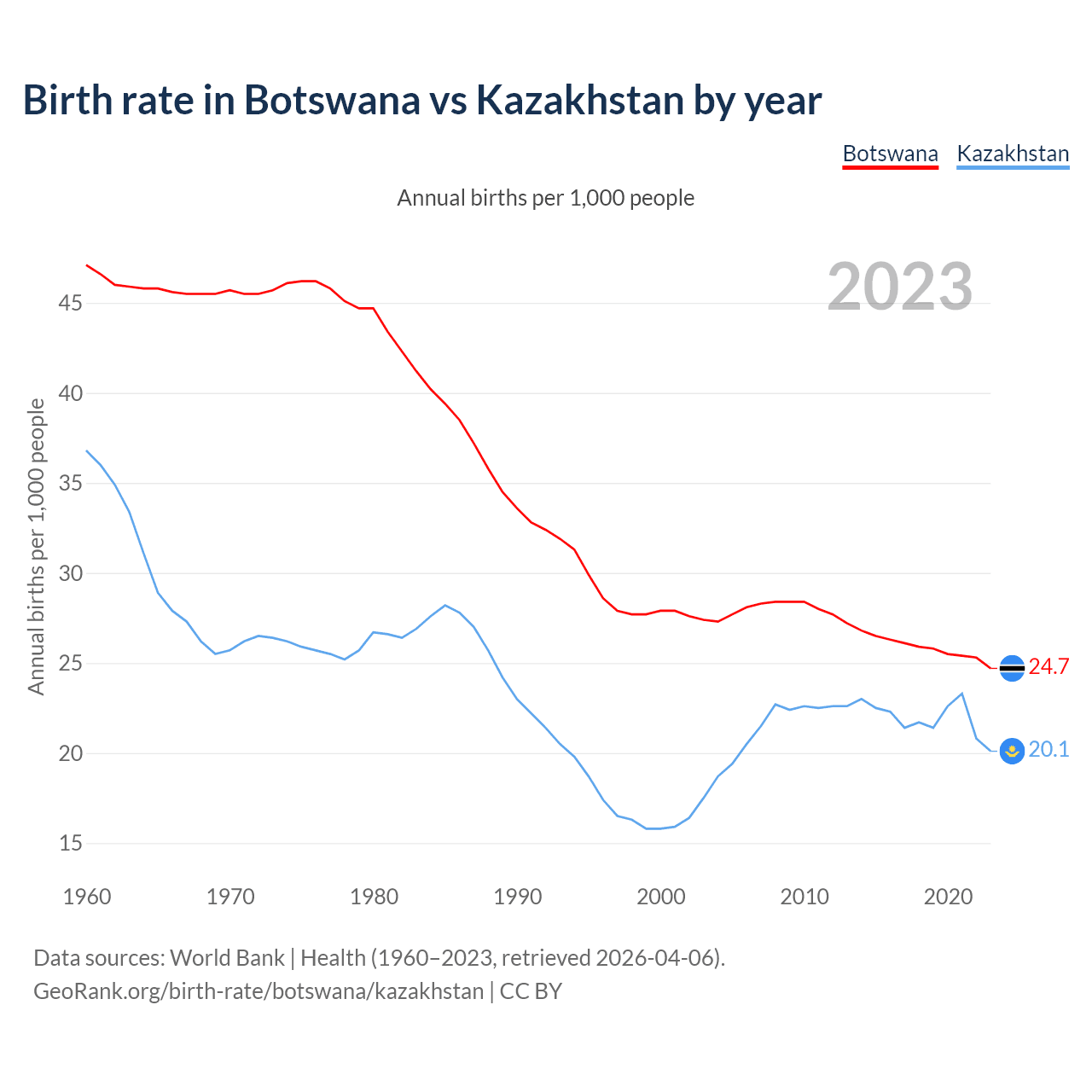 Botswana has an annual birth rate of 24.7 births per 1,000 people, compared to 20.1 for Kazakhstan. The average number of children a woman is expected to have during her lifetime — the fertility rate, is 2.73 in Botswana and 3.01 in Kazakhstan — 10.2% difference.