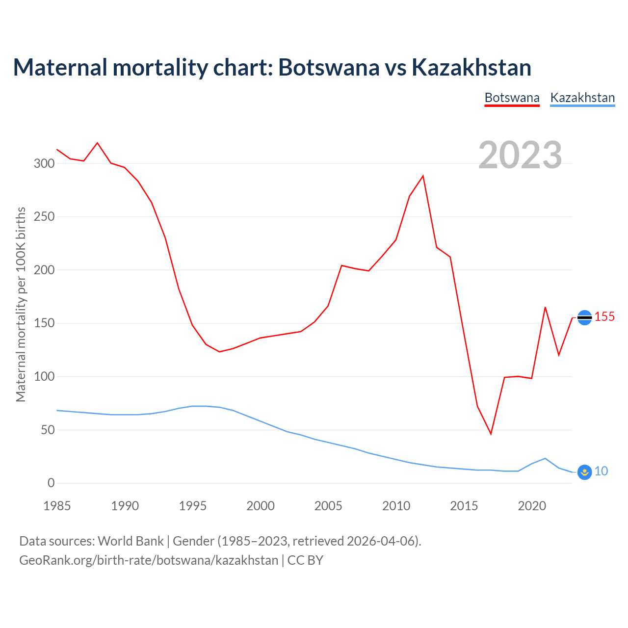 The maternal mortality rate, which is the probability of dying during childbirth or within 42 days of pregnancy termination, is 155 deaths per 100,000 live births in Botswana, compared to 10 deaths in Kazakhstan.
