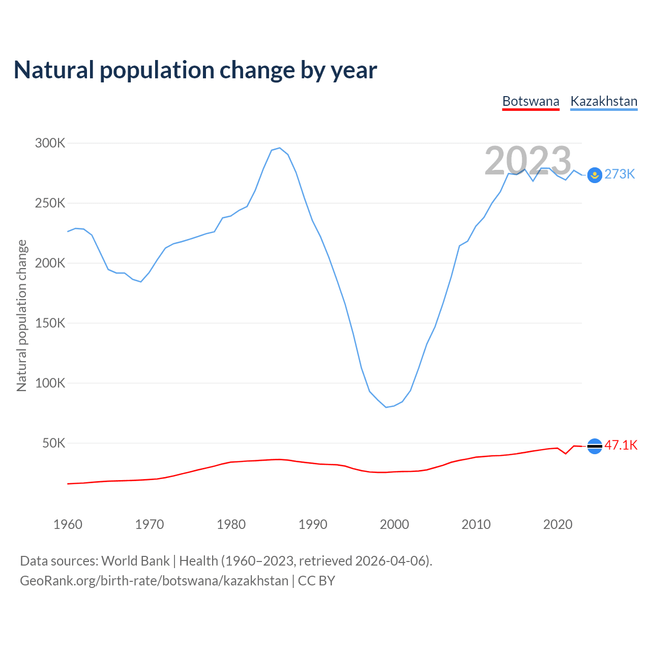 According to the latest available data on birth rates, the fertility rate in Botswana was 2.73 children per woman in 2023, compared to 3.01 in Kazakhstan in 2023. The replacement level is considered to be 2.1 children per woman.